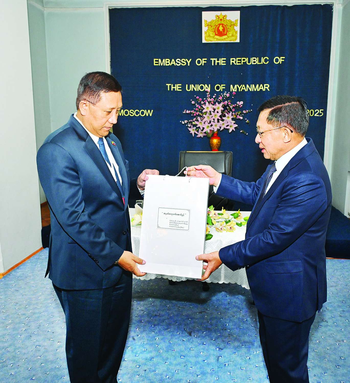 ထို့နောက် နိုင်ငံတော်စီမံအုပ်ချုပ်ရေးကောင်စီဥက္ကဋ္ဌ နိုင်ငံတော်ဝန်ကြီးချုပ်သည် ရုရှားဖက်ဒရေးရှင်းနိုင်ငံဆိုင်ရာ မြန်မာနိုင်ငံသံရုံး ဧည့်သည်တော်မှတ်တမ်းစာအုပ်တွင် မှတ်တမ်းတင်လက်မှတ်ရေးထိုးပြီး သံရုံး၊ စစ်သံရုံး မိသားစုများအား ရင်းရင်းနှီးနှီး နှုတ်ဆက်ခဲ့ကြောင်း သတင်းရရှိသည်။
