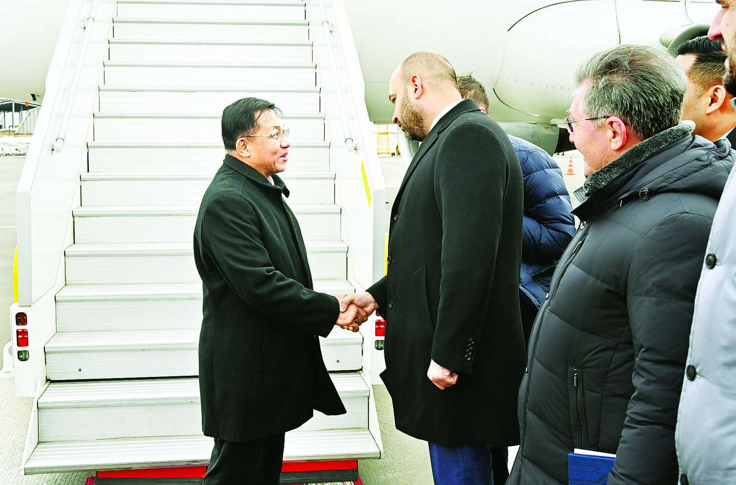 ဘယ်လာရုစ်သမ္မတနိုင်ငံသမ္မတ မစ္စတာလူကာရှန်းကော့၏ ဖိတ်ကြားချက်အရ ဘယ်လာရုစ်နိုင်ငံ မင့်စ်မြို့သို့ နိုင်ငံတော်အဆင့် (Offical State Visit) ချစ်ကြည်ရေးခရီး ရောက်ရှိနေသည့် နိုင်ငံတော်စီမံအုပ်ချုပ်ရေးကောင်စီဥက္ကဋ္ဌ နိုင်ငံတော်ဝန်ကြီးချုပ် ဗိုလ်ချုပ်မှူးကြီး မင်းအောင်လှိုင်သည် ယနေ့ဒေသစံတော်ချိန် နံနက်ပိုင်းတွင် မင့်စ်မြို့ အပြည်ပြည်ဆိုင်ရာလေဆိပ်မှ ပြန်လည်ထွက်ခွာရာ ဘယ်လာရုစ်နိုင်ငံနိုင်ငံခြားရေးဝန်ကြီး H.E. Mr. Maxim Ryzhenkov၊ မြန်မာကောင်စစ်ဝန်ချုပ် ဦးမိုးကျော်သူနှင့်တာဝန်ရှိသူများက လေဆိပ်တွင် ပို့ဆောင်နှုတ်ဆက်ကြသည်။