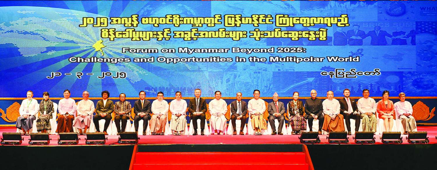 ၂၀၂၅ အလွန် ဗဟုဝင်ရိုးကမ္ဘာတွင် မြန်မာနိုင်ငံ ကြုံတွေ့လာရမည့် စိန်ခေါ်မှုများနှင့် အခွင့်အလမ်းများ သုံးသပ်ဆွေးနွေးပွဲဖွင့်ပွဲအခမ်းအနားကို ယနေ့နံနက်ပိုင်းတွင် နေပြည်တော်ရှိ မြန်မာအပြည်ပြည်ဆိုင်ရာကွန်ဗင်းရှင်းဗဟိုဌာန - ၁ ၌ ကျင်းပပြုလုပ်ရာ နိုင်ငံတော်စီမံအုပ်ချုပ်ရေးကောင်စီဥက္ကဋ္ဌ နိုင်ငံတော်ဝန်ကြီးချုပ် ဗိုလ်ချုပ်မှူးကြီး မင်းအောင်လှိုင် တက်ရောက်၍ အဖွင့်အမှာစကားပြောကြားသည်။