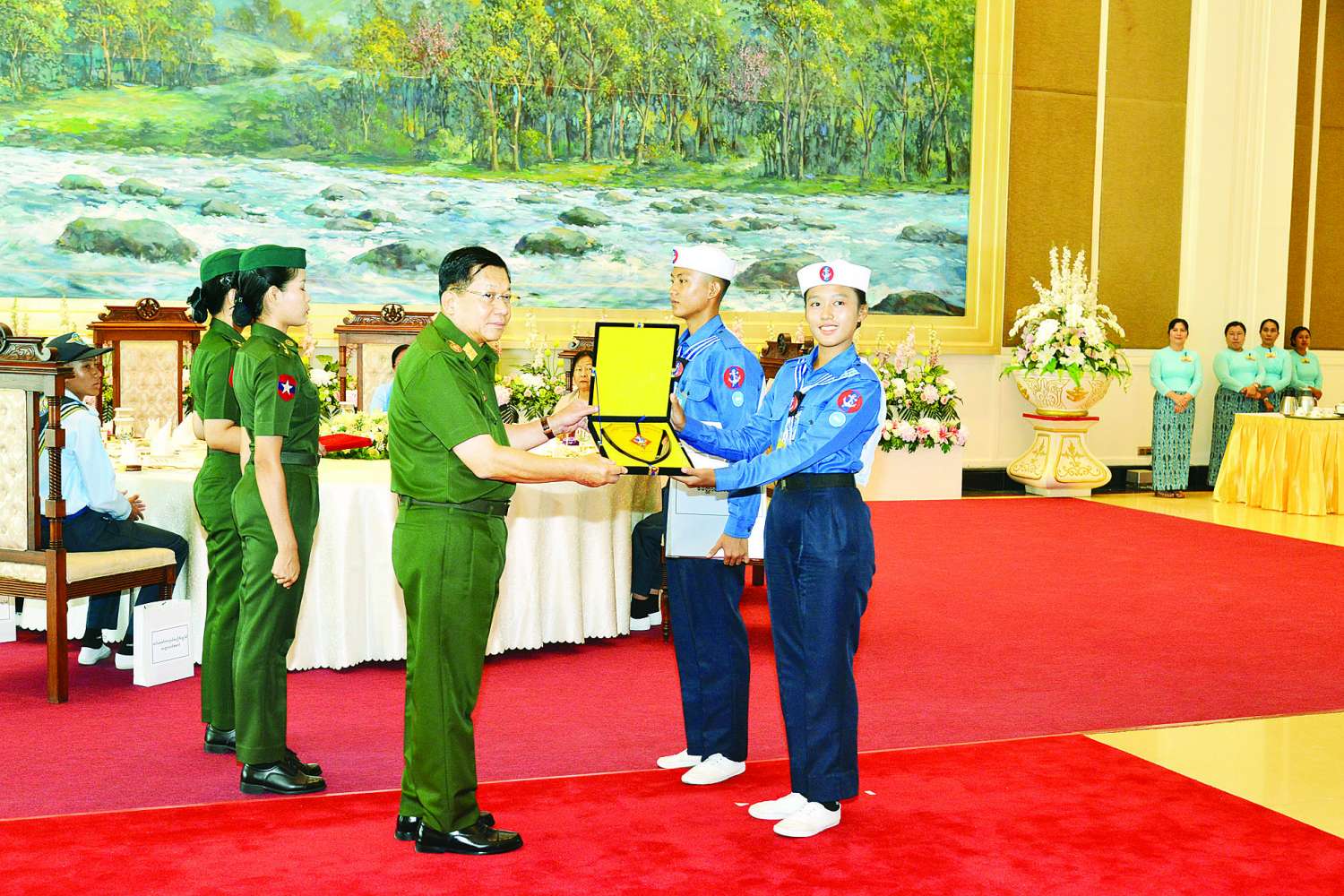 ယင်းနောက် နိုင်ငံတော်စီမံအုပ်ချုပ်ရေးကောင်စီဥက္ကဋ္ဌ တပ်မတော်ကာကွယ်ရေးဦးစီးချုပ်က ရေကြောင်းနှင့် လေကြောင်းလူငယ်မောင်မယ်များအတွက် အမှတ်တရ လက်ဆောင်ပစ္စည်းများ ပေးအပ်ပြီး လူငယ်မောင်မယ်များက နိုင်ငံတော်စီမံအုပ်ချုပ်ရေးကောင်စီဥက္ကဋ္ဌ တပ်မတော်ကာကွယ်ရေးဦးစီးချုပ်အား ဂါဝရပြုလက်ဆောင်ပစ္စည်းများ ပြန်လည်ပေးအပ်သည်။