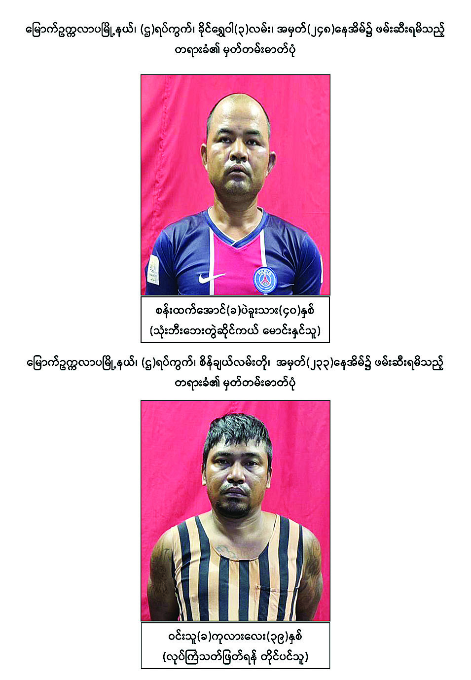 ဖမ်းဆီးရမိတရားခံများ၏ ထွက်ဆိုချက်အရ မေ ၂၅ ရက်တွင် ဦးချိုထွန်းအောင်အား လုပ်ကြံသတ်ဖြတ်ခဲ့ပြီး ထွက်ပြေးတိမ်းရှောင်နေသည့် တရားခံမျိုးကိုကို(ခ)စိုင်းကိုကို(ခ) ဇင်မင်းထက်(ခ)လင်း လက်ဇော်(၂၈)နှစ်၊ ၎င်း၏ဇနီးဖြစ်သူ ပြုံးပြုံး(၂၄)နှစ်၊ သမီးဖြစ်သူလင်းလက်ရွှေ (၆)နှစ်တို့အား ညောင်ဦးမြို့နယ် ပုဂံမြို့ဟောင်းတွင်လည်းကောင်း၊ ၎င်းတို့အား လိုက်ပါပို့ဆောင်ပေးခဲ့သည့် ယာဉ်မောင်း အောင်ဆန်းဟိန်း(၂၅)နှစ်နှင့် ချိတ်ဆက်ဆောင်ရွက်ပေးသူ ညီညီလှိုင်(၃၉)နှစ်တို့အား မွန်ပြည်နယ် မုဒုံမြို့တွင်လည်းကောင်း အသီးသီးဖမ်းဆီးရမိ ခဲ့သည်။