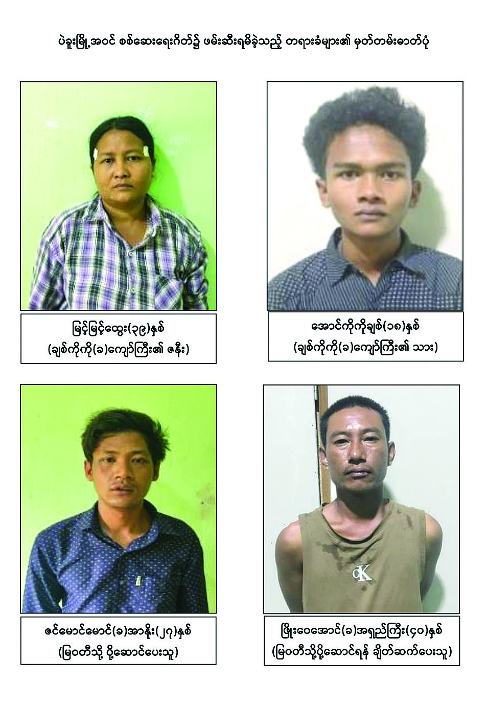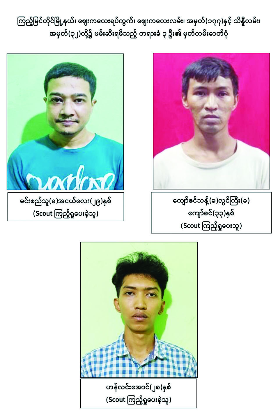 ဖမ်းဆီးရမိတရားခံများ၏ထွက်ဆိုချက်အရ မေ ၂၉ ရက်တွင် ဦးချိုထွန်းအောင်အား လုပ်ကြံသတ်ဖြတ်မှုအပါအဝင် ၎င်းတို့အကြမ်းဖက်အဖွဲ့ဆောင်ရွက်ခဲ့သော လုပ်ကြံသတ်ဖြတ်မှုများ၌ Scout ကြည့်ရှုပေးခဲ့သည့် တရားခံ မင်းစည်သူ(ခ)အငယ်လေး (၂၉)နှစ်နှင့် ကျော်ဇင်သန့်(ခ)လွင်ကြီး(ခ) ကျော်ဇင်(၃၃)နှစ်တို့အား ကြည့်မြင်တိုင်မြို့နယ် ဈေးကလေးရပ်ကွက် ဈေးကလေးလမ်း အမှတ်(၁၇၇)ရှိ နေအိမ်၌လည်း ကောင်း၊ တရားခံ ဟန်လင်းအောင် (၂၈)နှစ်၊ ကြည့် မြင်တိုင်မြို့နယ် သီတာရပ်ကွက် သိန္နိလမ်းအမှတ် (၃၂)နေသူအားလည်းကောင်း အသီးသီးထပ်မံ ဖမ်းဆီးရမိခဲ့သည်။