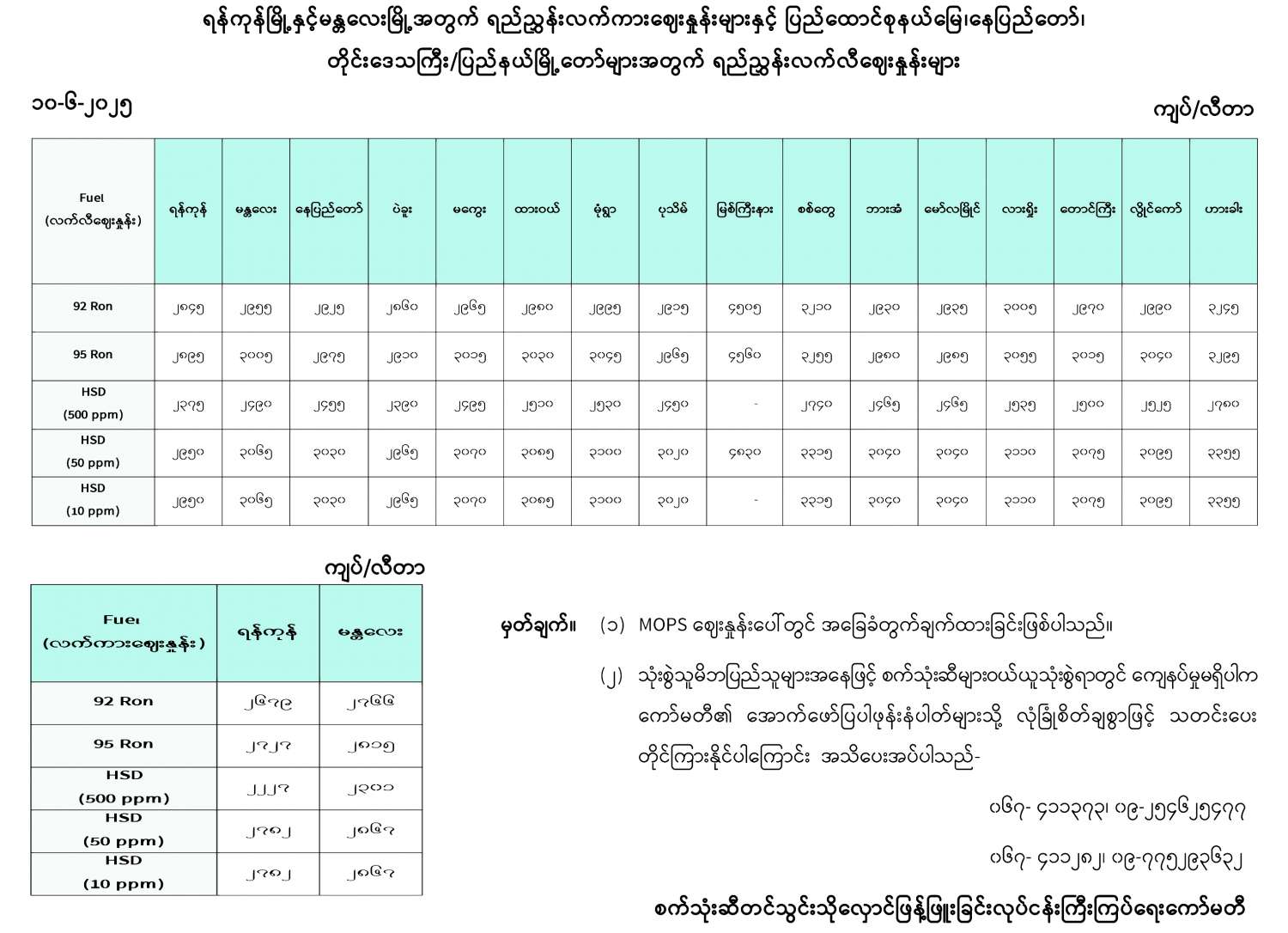 ရန်ကုန်မြို့နှင့် မန္တလေးမြို့အတွက် ရည်ညွှန်းလက်ကားဈေးနှုန်းများနှင့် ပြည်ထောင်စုနယ်မြေ နေပြည်တော်၊ တိုင်းဒေသကြီး/ပြည်နယ် မြို့တော်များအတွက် ရည်ညွှန်းလက်လီဈေးနှုန်းများ 06/10/2025