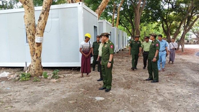 ထိုသို့ ဆောင်ရွက်ပေးလျက်ရှိရာ ယနေ့တွင် ကာကွယ်ရေးဦးစီးချုပ်ရုံး(ကြည်း)မှ ဒုတိယဗိုလ်ချုပ်ကြီးမျိုးသန့်နိုင်နှင့် တာဝန်ရှိသူများသည် ကျောက်ဆည်မြို့၊ ဆူးကုန်းရပ်ကွက်ရှိ ခရိုင်စုပေါင်းရုံးဝန်းအတွင်း Modular Container House များ ဆောက်လုပ်ပြီးစီးမှုအား သွားရောက်ကြည့်ရှုစစ်ဆေး၍ အသစ်ထပ်မံတည်ဆောက်မည့် မြေနေရာများအား ရွေးချယ်သတ်မှတ်ပေးပြီး တာဝန်ရှိသူများအား လိုအပ်သည်များ မှာကြားသည်။