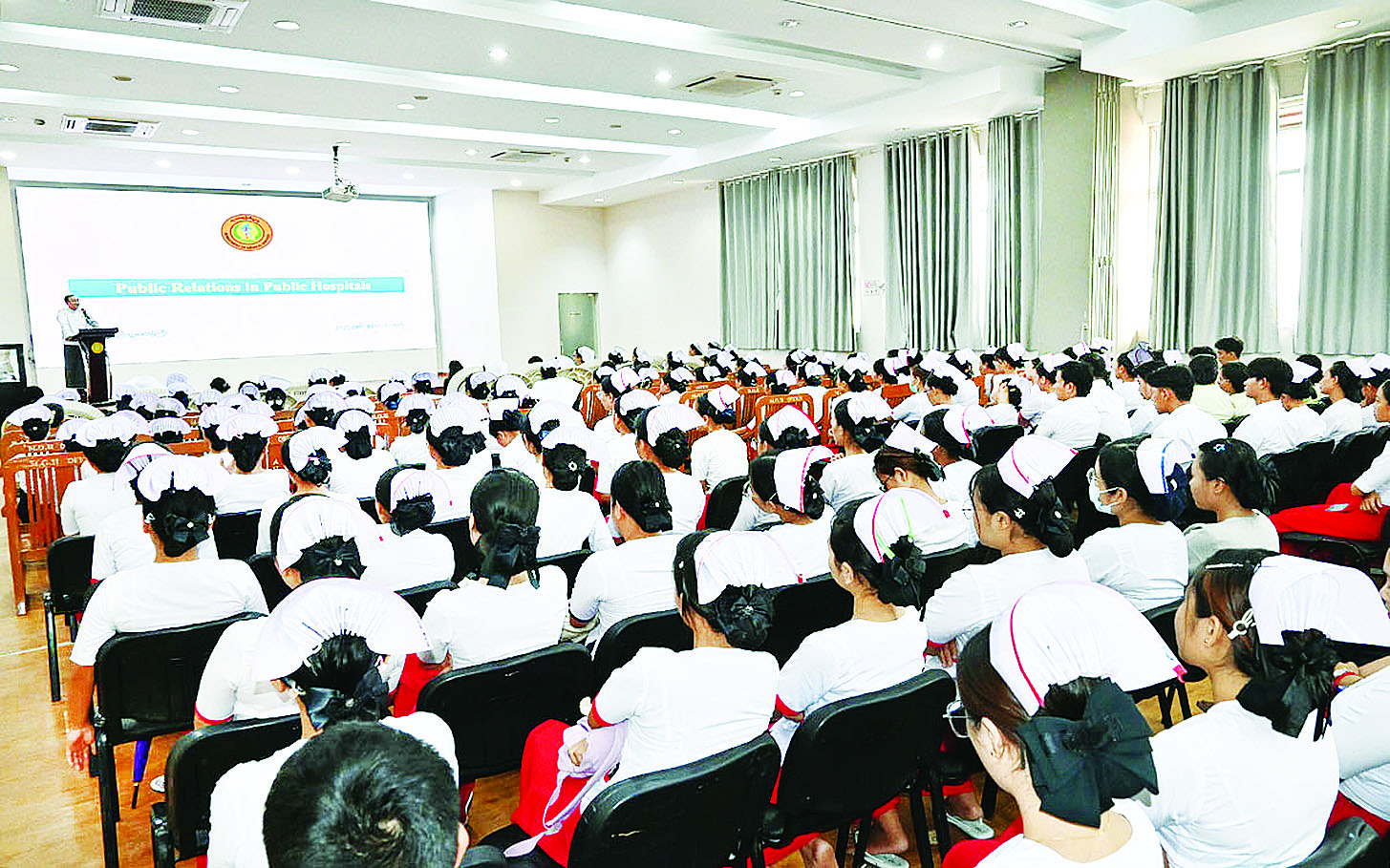 ပြည်သူ့ဆေးရုံများ၏ ပြည်သူ့ဆက်ဆံရေးလုပ်ငန်းဆိုင်ရာ ဆွေးနွေးပွဲကို ဇွန် ၉ ရက်မှ ၁၀ ရက်အထိ မန္တလေးပြည်သူ့ဆေးရုံကြီးရှိ မန်းတောင်ရိပ် (၉) ထပ်ဆောင်အစည်းအဝေးခန်းမ၌ ကျင်းပရာ ကျန်းမာရေးဝန်ကြီးဌာန ကုသရေးဦးစီးဌာန ဒုတိယညွှန်ကြားရေးမှူးချုပ် ဒေါက်တာသံလွင်ထွန်း၊ မန္တလေးပြည်သူ့ဆေးရုံအုပ်ကြီး ဒေါက်တာဆန်းလွင်ဦး၊ ဆေးရုံအုပ်များ၊ မန္တလေးမြို့ရှိ ဗဟိုအဆင့်ဆေးရုံကြီးများမှ သူနာပြုအုပ်ကြီးများ၊ သူနာပြုအုပ်များ၊ အထက်တန်းသူနာပြုများ၊ သူနာပြုများနှင့် တာဝန်ရှိသူများ တက်ရောက်ကြသည်။