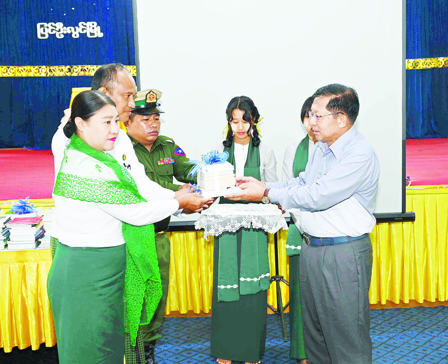 ယင်းနောက် နိုင်ငံတော်စီမံအုပ်ချုပ်ရေးကောင်စီဥက္ကဋ္ဌ နိုင်ငံတော်ဝန်ကြီးချုပ်က ကျောင်းစာကြည့်တိုက်အတွက် သုတ၊ ရသစာအုပ်စာစောင်များကို ပေးအပ်ရာ ကျောင်းအုပ်ချုပ်မှုတာဝန်ခံအရာရှိနှင့် ဆရာ၊ ဆရာမများက လက်ခံရယူကြသည်။