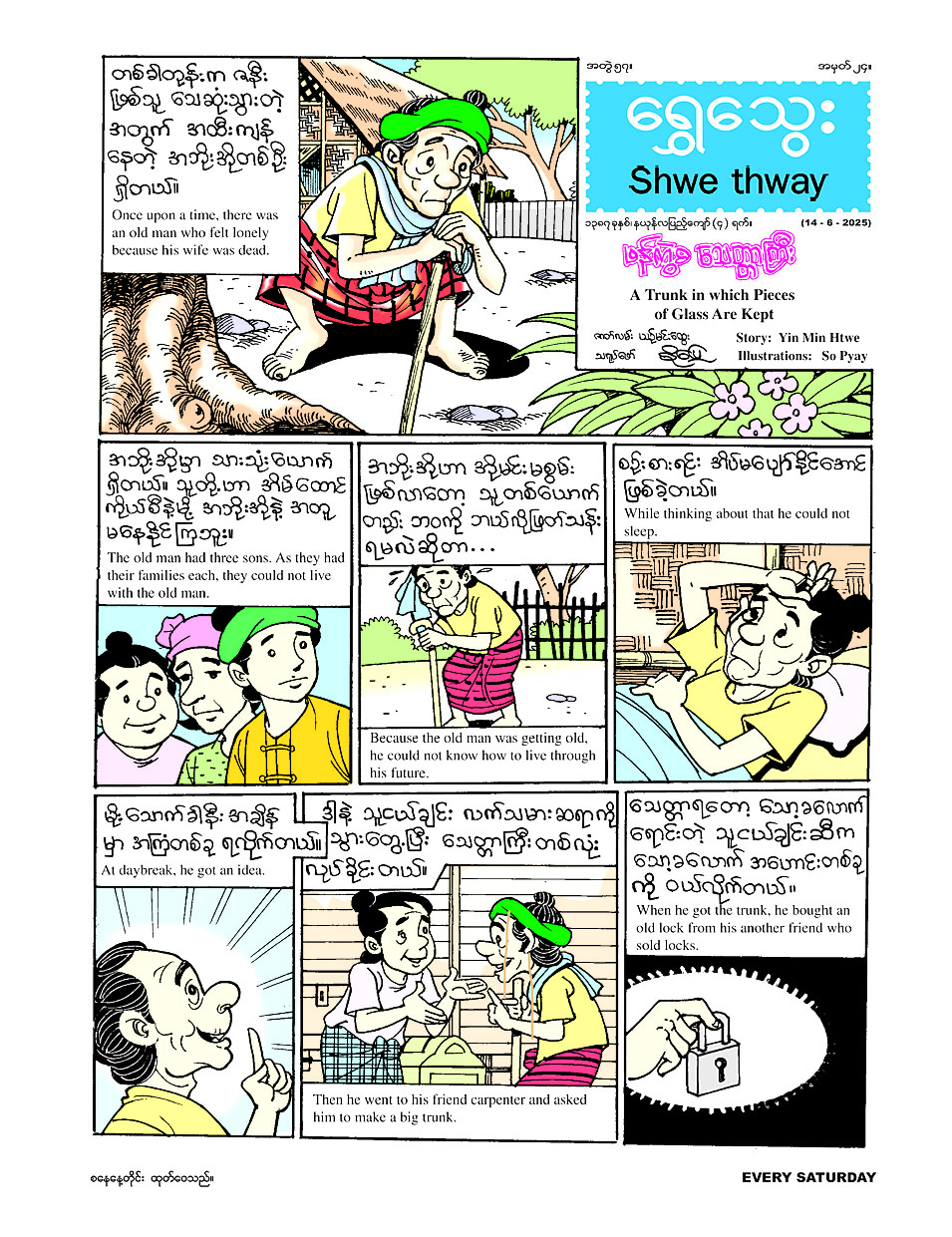 ၁၄ - ၆ - ၂၀၂၅ ရက် (စနေနေ့) တွင် ထွက်ရှိမည့် ရွှေသွေးဂျာနယ် အတွဲ (၅၇)၊ အမှတ် (၂၄) တွင် အဘိုးအိုသည် သူ၏ ဖြတ်ထိုးဉာဏ်ဖြင့် သားသုံးယောက်ကို ပညာပေးဆုံးမထားသည်ကို သရုပ်ဖော်ထားသော “ဖန်ကွဲစသေတ္တာကြီး” မျက်နှာ ဖုံးကာတွန်း၊ ကမ္ဘာမြေကြီးအကြောင်း၊ ဗဟုသုတရဖွယ်ရေးသားထားသည့် “ကမ္ဘာမြေကြီး၏ အတွင်းပိုင်းတည်ဆောက်ပုံ” သုတဆောင်းပါးကဏ္ဍ၊ ရန်ပိုင်စိုးသိချင်သော “ကောင်းမှုတစ်ခု၊ နေ့စဉ်ပြု” ဆိုသည့် အကြောင်းကို ဦးအောမှ ရှင်းပြထားသည်ကို သရုပ်ဖော်ထားသည့် “ရန်ပိုင်စိုး” နှစ်မျက်နှာကာတွန်း၊ သူ့အမှားကို သိသွားသော သန်းထိုက်မှာ သူငယ်ချင်းခင်ဇော်အပေါ် တောင်းပန်ထားသည့် အကြောင်းကို ရေးသားထားသည့် “ဖန်ဂေါ်လီလေးတစ်လုံး” ဝတ္ထုကဏ္ဍ၊ ကျောင်းတက်ပျင်းသော ကျော်ကြီးမှာ အောင်ဘုကျောင်းမတက်ရသည့် အကြောင်းကို စဉ်းစားမိ၍ သူ့အမှားကို သိရှိကာ နောင်တရသွားသည့်အကြောင်း သရုပ်ဖော်ထားသည့် “ကျော်ကြီး” တစ်မျက်နှာကာတွန်း၊ မောင်ကျော်ဟိုး၏ ရိုးသားမှုကြောင့် အလုပ်ရှင် ဇနီးမောင်နှံက “အမွေစားအမွေခံသား” အဖြစ် မွေးစားလိုက်သည့်အကြောင်း ရေးသားထားသည့် “ရိုးသားခြင်းရဲ့ရလဒ်” ပုံပြင်ကဏ္ဍ၊ ယုန်ကလေး၏ ဉာဏ်ပညာထက်မြက်ရဲရင့်မှုကြောင့် ဆင်အန္တရာယ်မှ ကင်းဝေးသွားသည့် သတ္တဝါလေးများ အကြောင်းကို သရုပ်ဖော်ထားသည့် “ယုံအောင်ပြောတဲ့ယုန်ကလေး” နှစ်မျက်နှာကာတွန်း၊ မွှေးရနံ့တို့တွင် မေတ္တာမွှေးရနံ့သည်သာ အမွှေးဆုံးဖြစ်သည်ဆိုသော ပန်ပန်အကြောင်း သရုပ်ဖော်ထားသည့် “ပန်းခရေလိုမွှေးပါစေ”နှစ်မျက်နှာကာတွန်း၊ ကျေးလက်ဒေသတွင် ပန်းများ ဝေဝေဆာဆာပွင့်ပုံ၊ ငှက်ကလေး၏ အသံမှာ ချိုသာပုံနှင့်အရုဏ်ဦးမှာ ဆွမ်းလောင်းလှူပုံအကြောင်းတို့ကို ရေးဖွဲ့ထားသည့် “ကျေးလက်နံနက်” ကဗျာ ကဏ္ဍစုံလင်စွာဖြင့် ထွက်ရှိပြီဖြစ်ရာ တစ်စောင်လျှင် ငွေကျပ် ၄၀၀ ဖြင့် စာပေဗိမာန်စာအုပ်အရောင်းဆိုင်များတွင် ဝယ်ယူနိုင်ကြောင်း သိရသည်။