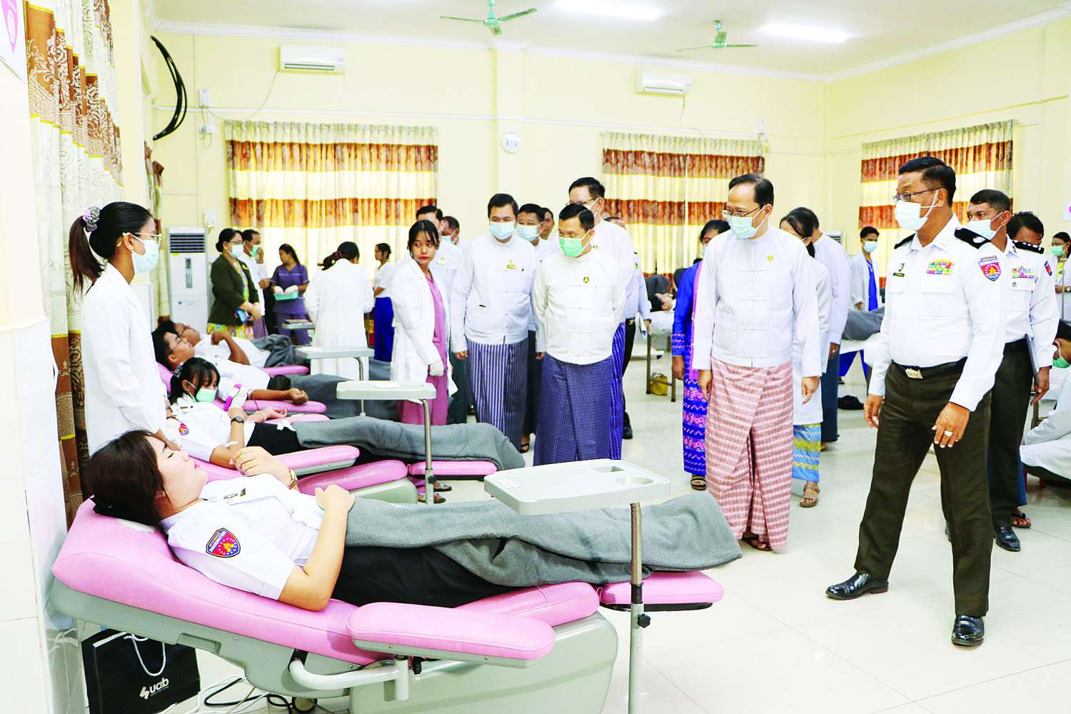 ထို့နောက် ပြည်ထောင်စုဝန်ကြီးများသည် ခန်းမအတွင်း၌ သွေးလှူဒါန်းနိုင်ရေး စစ်ဆေးပြီးစီးသည့် ဝန်ထမ်းများ စုပေါင်းသွေးလှူဒါန်းနေမှုကို လိုက်လံကြည့်ရှုအားပေးစကားပြောကြားကြပြီး သွေးအလှူရှင်ဝန်ထမ်းများအား အာဟာရဖြည့်စွက်စာများနှင့် ထောက်ပံ့ငွေများကို ချီးမြှင့်ပေးအပ်ကြသည်။