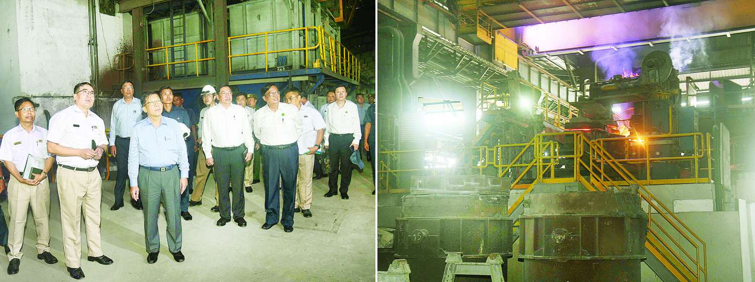 ဆက်လက်၍ စက်ရုံမှ ထွက်ရှိသည့် သံမဏိများနှင့် ပြည်ပနိုင်ငံများမှ ထုတ်လုပ်ထားသည့် သံမဏိများအား အရည်အသွေး နှိုင်းယှဉ်ပြသထားရှိမှုအား ကြည့်ရှုစစ်ဆေးပြီး စက်ရုံအတွင်း လှည့်လည်၍ HRB-500 Steel Billet များ ထုတ်လုပ်နေမှုလုပ်ငန်းစဉ်အဆင့်ဆင့်အား ကြည့်ရှုစစ်ဆေးပြီး တာဝန်ရှိသူများ၏ တင်ပြချက်များအပေါ် လိုအပ်သည်များ လမ်းညွှန်မှာကြားသည်။