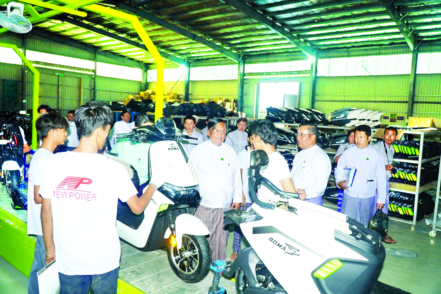 မွန်းလွဲပိုင်းတွင် ပြည်ထောင်စုဝန်ကြီးသည် ဒက္ခိဏသီရိစက်မှုဇုန်ရှိ မြန်မာနယူးပါဝါကုမ္ပဏီ လီမိတက်၏ မော်တော်ဆိုင်ကယ်တပ်ဆင်ထုတ်လုပ် ရေးစက်ရုံ၌ မော်တော်ဆိုင်ကယ်များ တပ်ဆင်ထုတ်လုပ်နေမှုနှင့် လျှပ်စစ်သုံးမော်တော်ဆိုင်ကယ်များ ထုတ်လုပ်နေမှုတို့ကို လှည့်လည်ကြည့်ရှုစစ်ဆေးပြီး မော်တော်ဆိုင်ကယ်ထုတ်လုပ်ခြင်းနှင့်ပတ်သက်သည့် နည်းပညာများ လွှဲပြောင်းရရှိနိုင်ရေး စီမံဆောင်ရွက်ရန်၊ ဝန်ဆောင်မှုလုပ်ငန်းများ ဆောင်ရွက်ပေးရန်နှင့် အပိုပစ္စည်းများ လွယ်လင့်တကူဝယ်ယူအသုံးပြု နိုင်ရေးစီမံဆောင်ရွက်ထားရှိရန် မှာကြားခဲ့ကြောင်း သိရသည်။