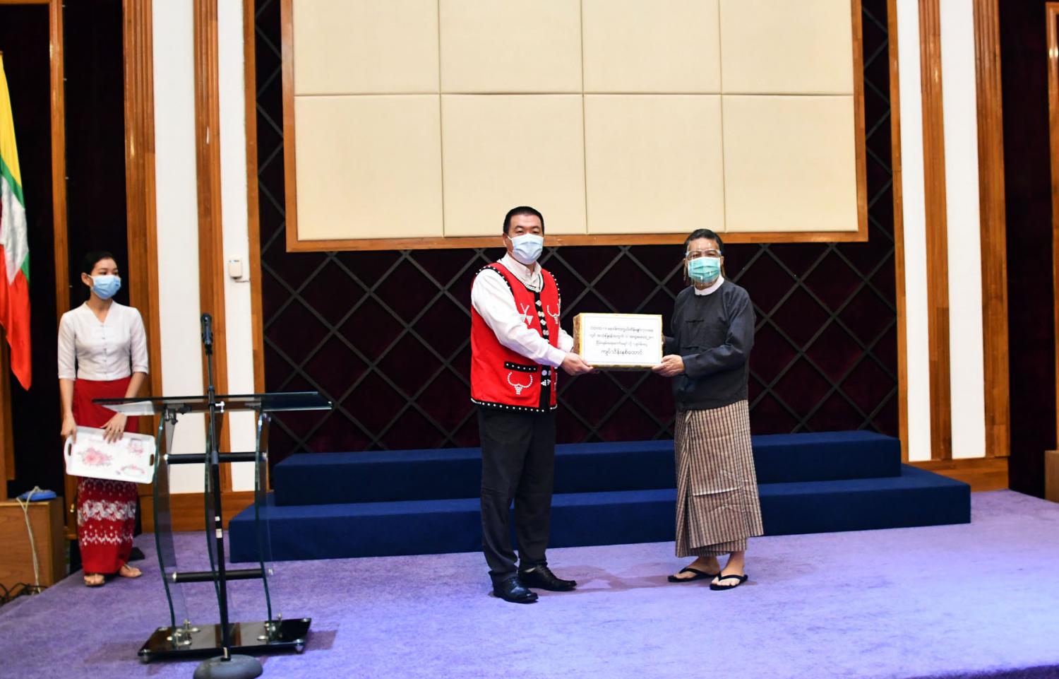 ဆက်လက်၍အထူးဒေသ() ကိုယ်စားလှယ် ဦးအိုက်စံရွှေက  ကိုဗစ်-၁၉ ရောဂါကာကွယ်ထိန်းချုပ်ရေးတွင် အသုံးပြုရန်အတွက် လှူဒါန်းငွေ ကျပ်သိန်း (၂၀၀၀) ကို ပေးအပ်လှူဒါန်းရာ ငြိမ်းချမ်းရေးကော်မရှင် ဥက္ကဋ္ဌ ဒေါက်တာတင်မျိုးဝင်းက လက်ခံရ ယူပြီး ဂုဏ်ပြုမှတ်တမ်းလွှာ ပြန်လည်ပေးအပ်သည်။