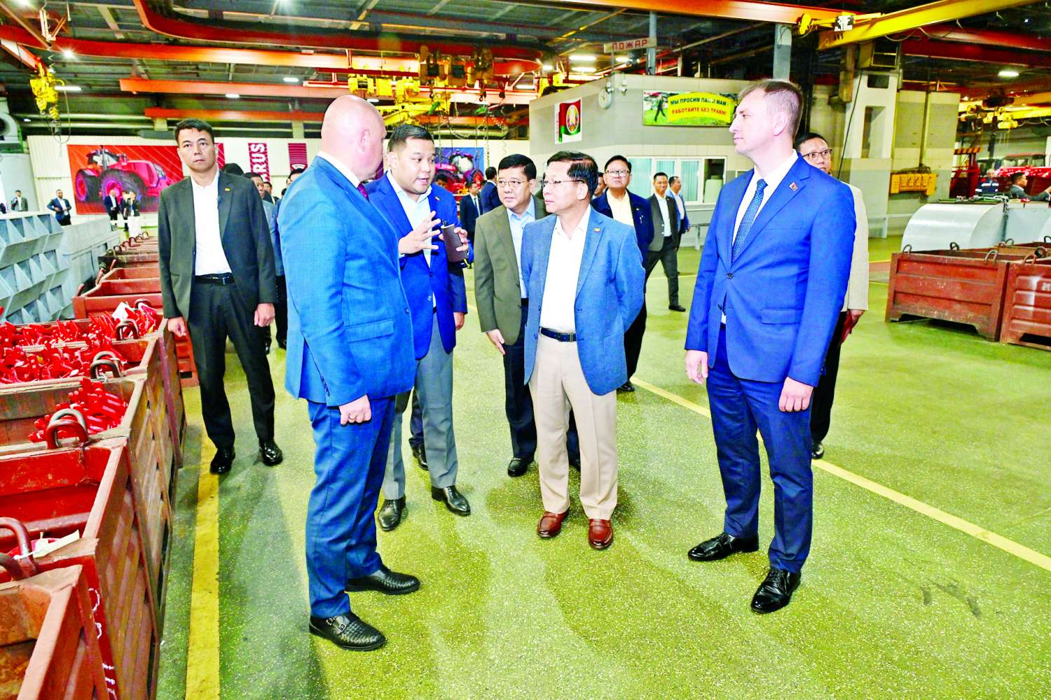 ထို့နောက် နိုင်ငံတော်စီမံအုပ်ချုပ်ရေးကောင်စီဥက္ကဋ္ဌ နိုင်ငံတော်ဝန်ကြီးချုပ်နှင့်အဖွဲ့ဝင်များသည် Minsk Tractor Works ထွန်စက်စက်ရုံအတွင်း ထွန်စက်များ တပ်ဆင်ထုတ်လုပ်နေမှုအဆင့်ဆင့်ကို လှည့်လည်ကြည့်ရှုလေ့လာခဲ့ကြပြီး တာဝန်ရှိသူများ၏ ရှင်းလင်းတင်ပြမှုများအပေါ် သိရှိလိုသည်များ ပြန်လည်မေးမြန်းဆွေးနွေးသည်။