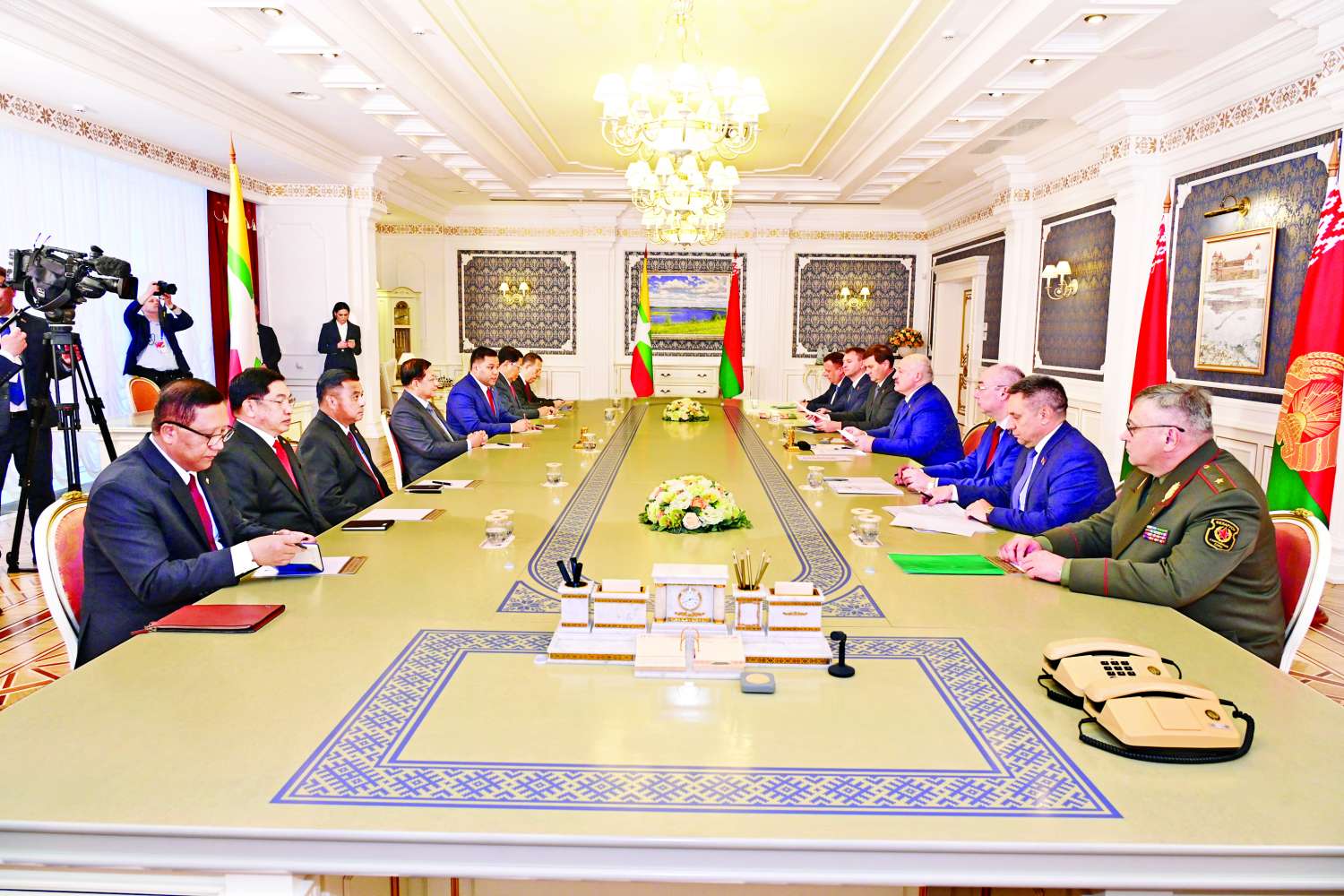 နိုင်ငံတော်စီမံအုပ်ချုပ်ရေးကောင်စီဥက္ကဋ္ဌ နိုင်ငံတော်ဝန်ကြီးချုပ် ဗိုလ်ချုပ်မှူးကြီး မင်းအောင်လှိုင်သည် ယနေ့မွန်းလွဲပိုင်းတွင် ဘယ်လာရုစ်သမ္မတနိုင်ငံသမ္မတ H.E. Mr. Alexander Gregoryevich Lukashenko နှင့် ဘယ်လာရုစ်နိုင်ငံမင့်စ်မြို့ရှိ သမ္မတနန်းတော်ဧည့်ခန်းမဆောင်၌ တွေ့ဆုံဆွေးနွေးသည်။