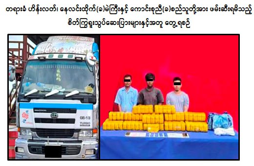 မူးယစ်ဆေးဝါးတားဆီးနှိမ်နင်းရေးရဲတပ်ဖွဲ့မှ တပ်ဖွဲ့ဝင်များပါဝင်သော ပူးပေါင်းအဖွဲ့သည် ဇွန်လ ၂၄ ရက်နေ့ နံနက် ၅ နာရီအချိန် ဝေါမြို့နယ်၊ ညောင်ခါးရှည်ကျေးရွာအနီးတွင် ရန်ကုန်မှထားဝယ်သို့ ဟိန်းလတ်မောင်းနှင်ပြီး နေလင်းထိုက်(ခ)မဲကြီးနှင့် ကောင်းစုညီ(ခ)စည်သူတို့ လိုက်ပါလာသော NISSAN ၆ ဘီးမော်တော်ယာဉ်အား သတင်းအရရှာဖွေရာ ယာဉ်ပေါ်မှ စိတ်ကြွရူးသွပ်ဆေးပြား ၉ သိန်း(တစ်ပြားလျှင် ငွေ ၁၅၀၀ ကျပ်နှုန်းဖြင့် ၎င်းဒေသတန်ဖိုး ငွေကျပ် ၁.၃၅ ဘီလီယံ) ဖမ်းဆီးရမိခဲ့ပြီး စစ်ဆေးဖော်ထုတ်ချက်အရ ဖမ်းဆီးရမိ စိတ်ကြွရူးသွပ်ဆေးပြားများအား ရန်ကုန်မှတစ်ဆင့်ထားဝယ်သို့ သယ်ဆောင်ရောင်းဝယ်ခြင်းဖြစ်ကြောင်း သိရှိရသဖြင့် ၎င်းတို့ ၃ ဦးအား ဥပဒေအရ အရေးယူထားရှိပြီး ကွင်းဆက်ပြစ်မှု ကျူးလွန်သူများအား ဆက်လက်ဖော်ထုတ်လျက်ရှိကြောင်း မြန်မာနိုင်ငံရဲတပ်ဖွဲ့မှ သတင်းရရှိသည်။