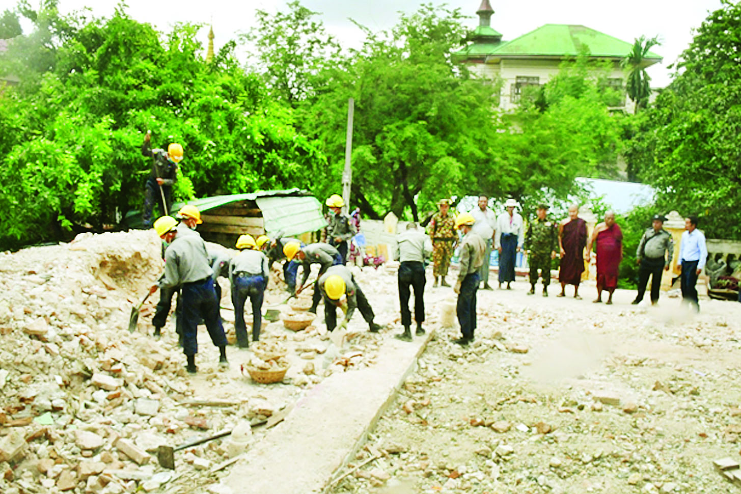 ထိုသို့ဆောင်ရွက်ပေးလျက်ရှိရာ ယနေ့တွင် စစ်ကိုင်းတိုင်းဒေသကြီး ဝန်ကြီးချုပ် ဦးမြတ်ကျော်၊ ကာကွယ်ရေးဦးစီးချုပ်ရုံး (ကြည်း) မှ ဒုတိယဗိုလ်ချုပ်ကြီး သက်ပုံနှင့် တာဝန်ရှိသူများသည် စစ်ကိုင်းမြို့အတွင်းရှိ ရွှေစေတီဘာသန္တရသင်တန်းကျောင်းရှိ ငလျင်ဒဏ်ကြောင့် ထိခိုက်ပျက်စီးခဲ့သော သာသနိက အဆောက်အအုံများကို စက်ယန္တရားကြီးအသုံးပြု၍ အပြီးသတ်ဖယ်ရှားရှင်းလင်းနေမှုတို့ကို ကြည့်ရှုစစ်ဆေးပြီး လိုအပ်သည်များ ပေါင်းစပ်ညှိနှိုင်းဆောင်ရွက်ပေးသည်။
