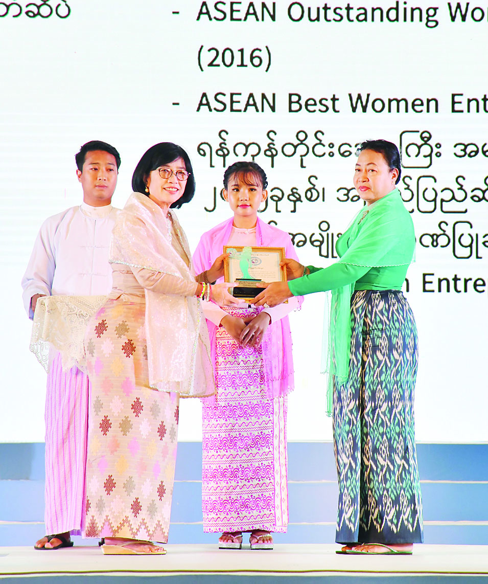 ဆက်လက်၍ နိုင်ငံတော်စီမံအုပ်ချုပ်ရေးကောင်စီအဖွဲ့ဝင်များ၏ ဇနီးများနှင့် လူမှုဝန်ထမ်း၊ ကယ်ဆယ်ရေးနှင့် ပြန်လည်နေရာချထားရေးဝန်ကြီးဌာန ပြည်ထောင်စုဝန်ကြီး ဒေါက်တာစိုးဝင်းတို့က အမျိုးသမီးစီးပွားရေးစွမ်းဆောင်ရှင် ဆုရရှိသူများအား ဂုဏ်ပြုဆုတံဆိပ်၊ ဂုဏ်ပြုမှတ်တမ်းလွှာနှင့် ဂုဏ်ပြုဆုငွေများ ပေးအပ်ချီးမြှင့်ကြသည်။