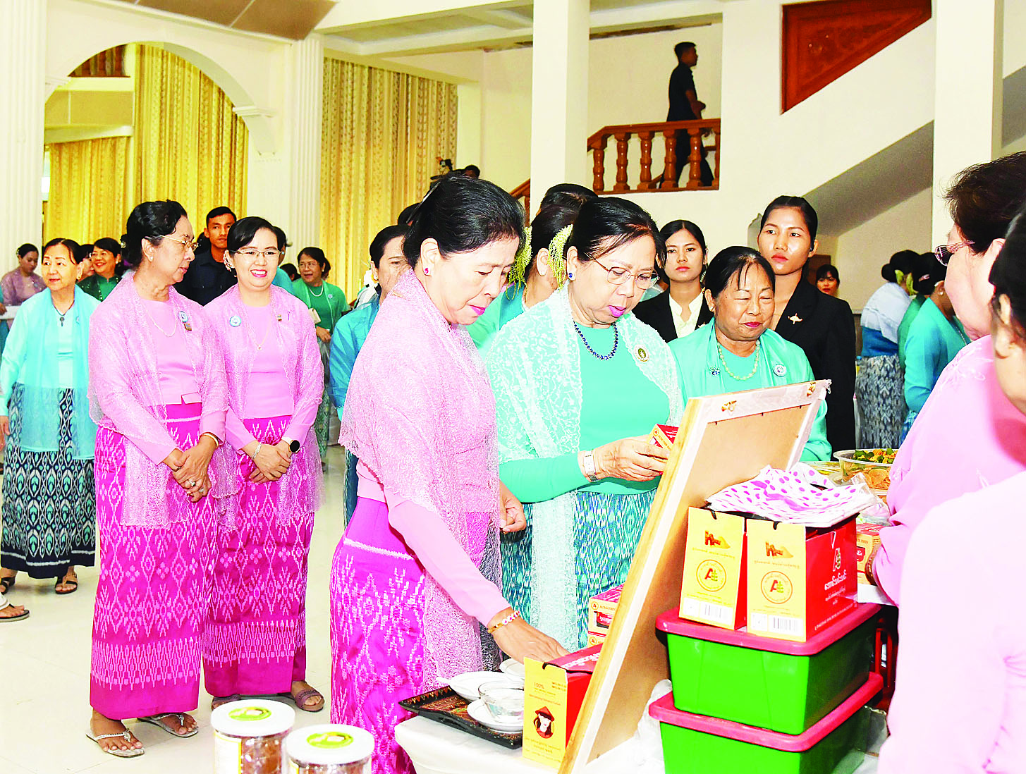 ထို့နောက် နိုင်ငံတော်စီမံအုပ်ချုပ်ရေးကောင်စီဥက္ကဋ္ဌ နိုင်ငံတော်ဝန်ကြီးချုပ်၏ ဇနီး၊ မြန်မာနိုင်ငံအမျိုးသမီးရေးရာအဖွဲ့ချုပ် ဂုဏ်ထူးဆောင်နာယက ဒေါ်ကြူကြူလှသည် အခမ်းအနားသို့ တက်ရောက်လာကြသူများနှင့်အတူ စုပေါင်းမှတ်တမ်းတင်ဓာတ်ပုံရိုက်ပြီး ၂၀၂၅ ခုနှစ် မြန်မာအမျိုးသမီးများနေ့အထိမ်းအမှတ် ခင်းကျင်းပြသထားသည့် လူမှုဝန်ထမ်းဦးစီးဌာန အမျိုးသမီးကျောင်းများနှင့် အမျိုးသမီးအဖွဲ့အစည်းများမှ ထုတ်ကုန်ပစ္စည်းများကို ကြည့်ရှုလေ့လာအားပေးခဲ့ကြောင်း သိရသည်။