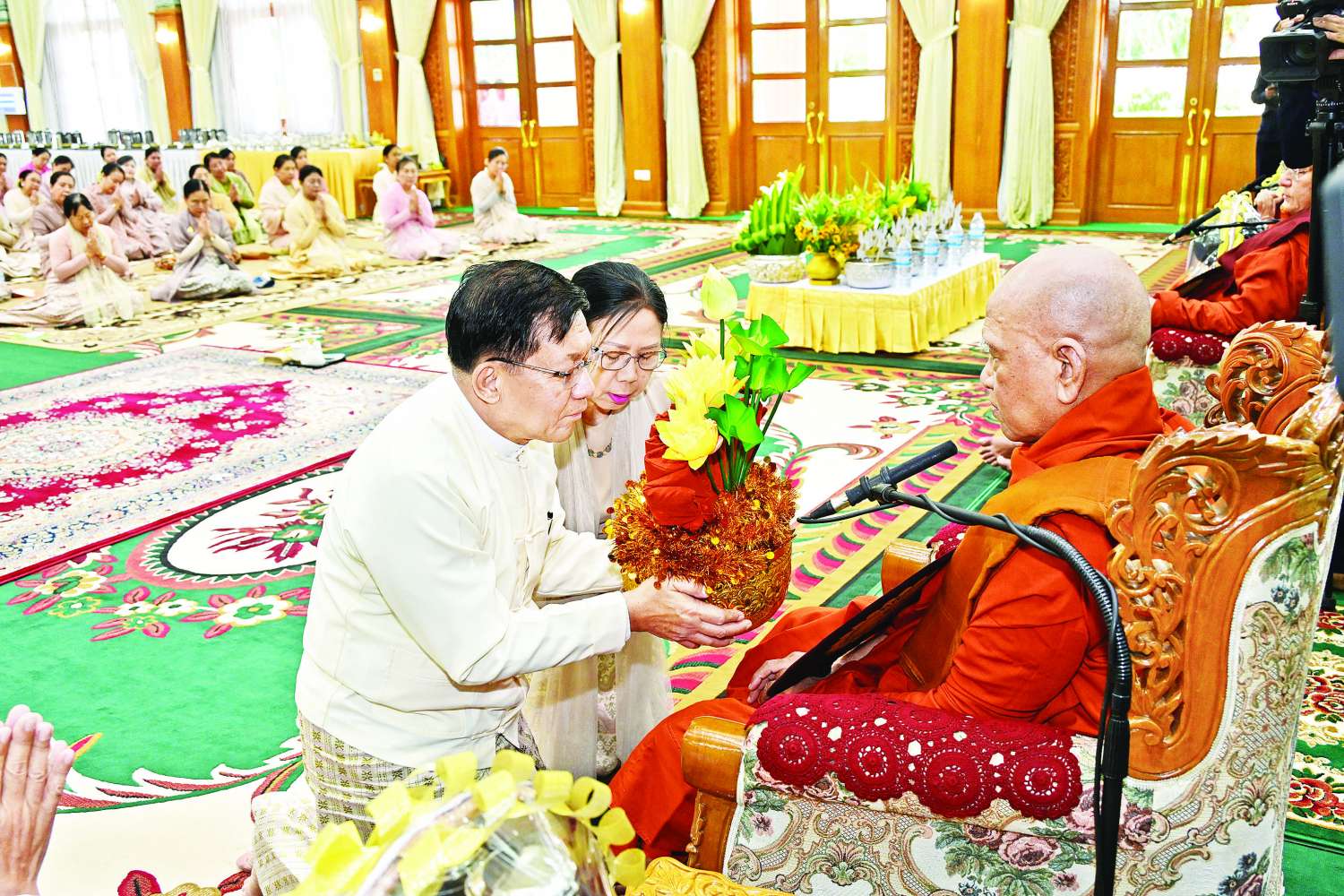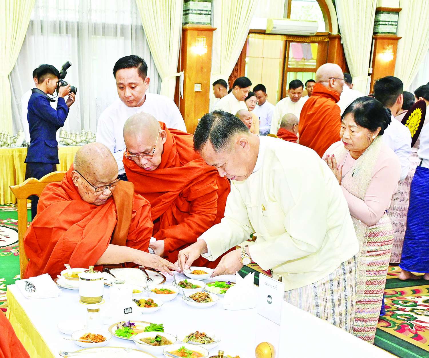 ယင်းနောက် နိုင်ငံတော်စီမံအုပ်ချုပ်ရေးကောင်စီဒုတိယဥက္ကဋ္ဌ ဒုတိယတပ်မတော်ကာကွယ်ရေးဦးစီးချုပ် ကာကွယ်ရေးဦးစီးချုပ် (ကြည်း) နှင့် ဇနီးက နိုင်ငံတော်သံဃမဟာနာယကအဖွဲ့အကျိုးတော်ဆောင် မစိုးရိမ်တိုက်သစ်ဆရာတော်ကြီးထံ ဝါဆိုသင်္ကန်းနှင့် လှူဖွယ်ပစ္စည်းများကို ဆက်ကပ်လှူဒါန်းသည်။