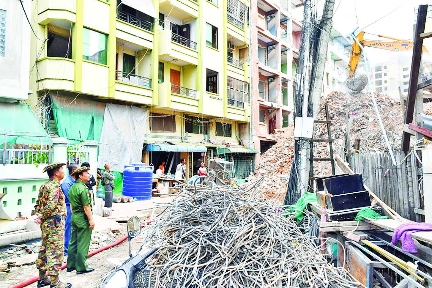 မန္တလေးငလျင်ကြီးကြောင့် ထိခိုက်ပျက်စီးခဲ့ရသည့် နေရာများ၌ ပြန်လည်ထူထောင်ရေးလုပ်ငန်းများကို အဖွဲ့အစည်းအသီးသီးက ဒေသခံပြည်သူများနှင့် ပူးပေါင်း၍ အင်တိုက်အားတိုက် ကူညီဆောင်ရွက်ပေးလျက်ရှိရာ ယနေ့တွင် မန္တလေးမြို့၊ အောင်မြေသာစံမြို့နယ်၊ အနှိပ်တော်ရပ်ကွက်၊ Sky Villa ၌ ငလျင်ဒဏ်ကြောင့် ထိခိုက်ပျက်စီးခဲ့ပြီး ရှင်းလင်းရန် ကျန်ရှိနေသည့် “A” ဆောင်အား စက်ယန္တရားကြီးများ အသုံးပြု၍ ဖယ်ရှားရှင်းလင်းရေးလုပ်ငန်းများနှင့် အောင်မြေသာစံမြို့နယ်၊ ပုလဲငွေရောင်ရပ်ကွက်ရှိ ငလျင်ဒဏ်ကြောင့် ပြိုကျပျက်စီးခဲ့သော အန္တရာယ်ရှိ အဆောက်အအုံအပျက်အစီးများအား စက်ယန္တရားကြီးများ အသုံးပြု၍ အပြီးသတ်ဖယ်ရှား ရှင်းလင်းမှုများကို ဆောင်ရွက်ပေးကြသည်။