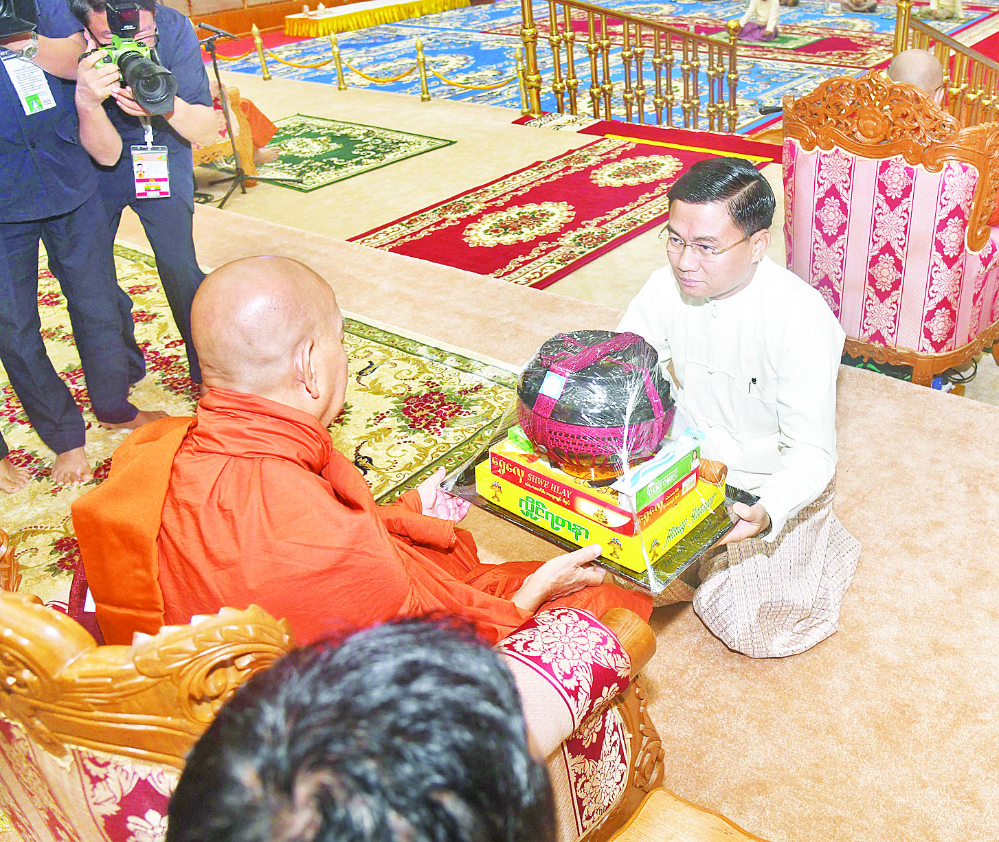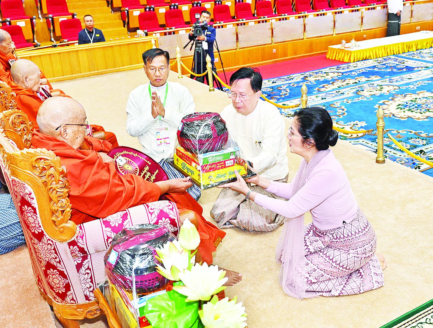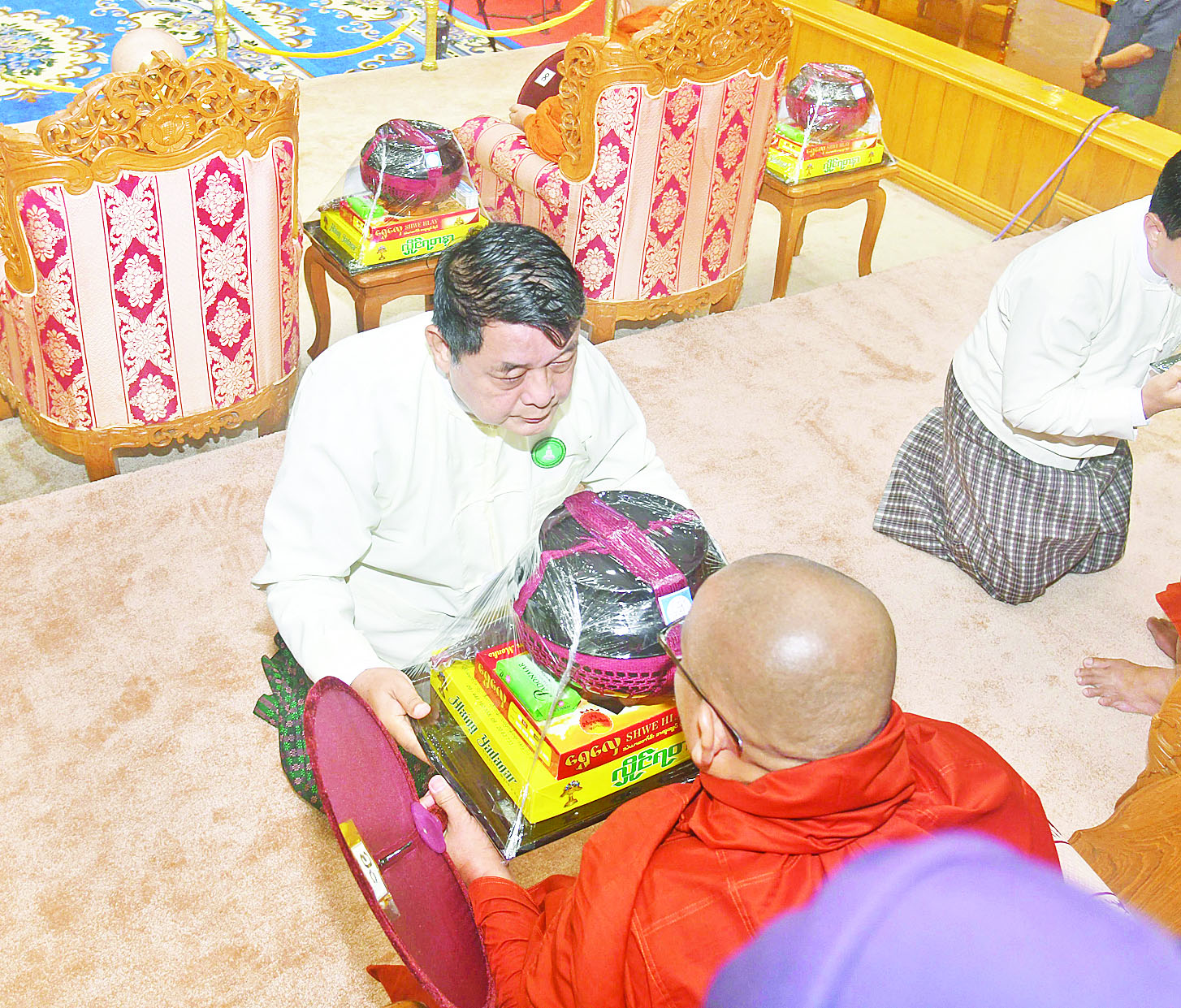 ယင်းနောက် နိုင်ငံတော်စီမံအုပ်ချုပ်ရေးကောင်စီဒုတိယဥက္ကဋ္ဌ ဒုတိယဝန်ကြီးချုပ်နှင့် ဇနီးတို့က မစိုးရိမ်တိုက်သစ်ဆရာတော်ကြီးထံ ဝါဆိုသင်္ကန်းနှင့် လှူဖွယ်ပစ္စည်းများကို ဆက်ကပ်လှူဒါန်းသည်။ ဆက်လက်၍ ကောင်စီအတွင်းရေးမှူးနှင့်ဇနီး၊ တွဲဖက်အတွင်းရေးမှူးနှင့်ဇနီး၊ ကောင်စီဝင်များနှင့်ဇနီးများ၊ ပြည်ထောင်စုအဆင့်ပုဂ္ဂိုလ်များက ဆရာတော်၊ သံဃာတော်များထံ ဝါဆိုသင်္ကန်းနှင့် လှူဖွယ်ပစ္စည်းများကို အသီးသီးဆက်ကပ်လှူဒါန်းကြသည်။