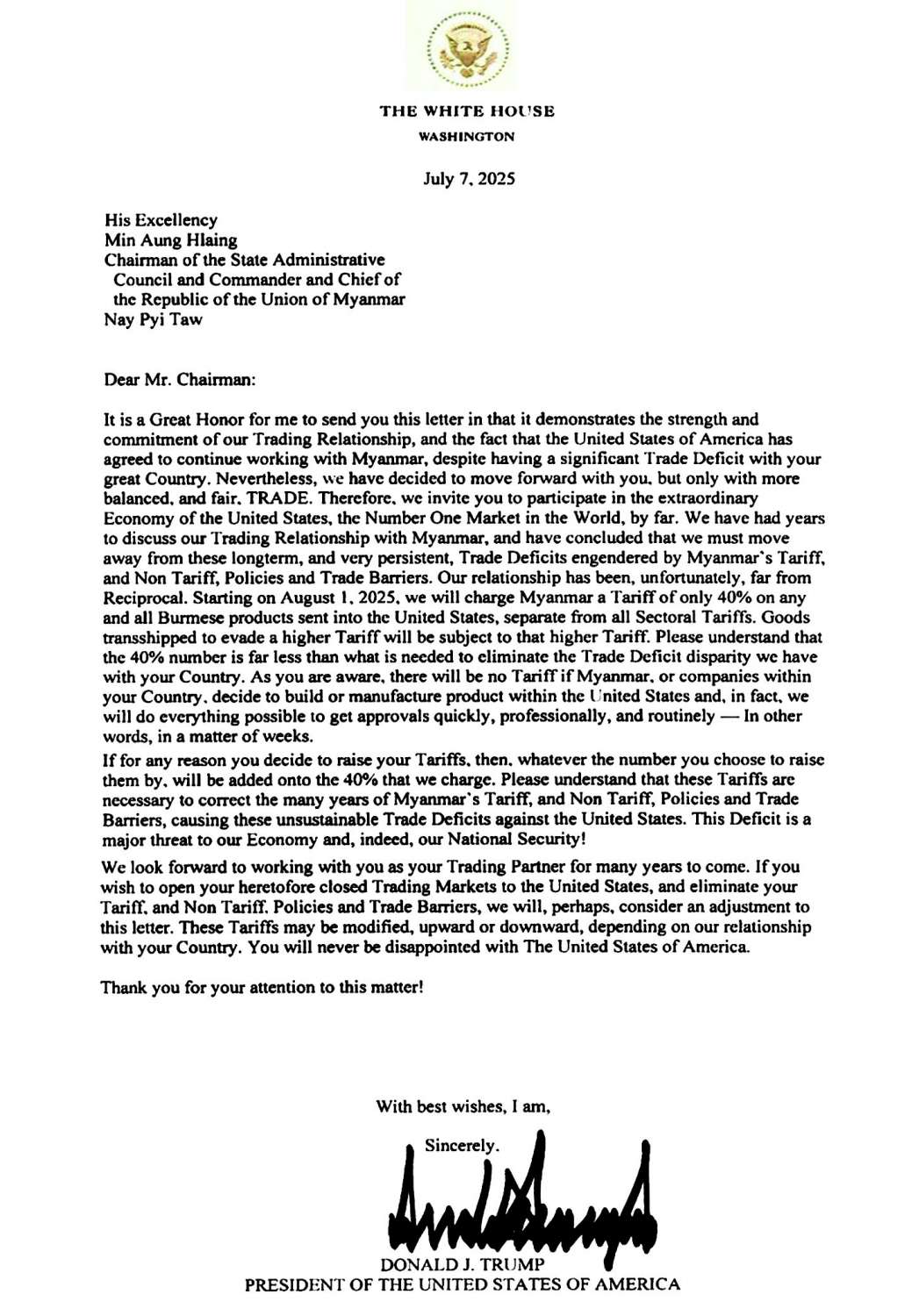ထိုသို့ပေးပို့ရာတွင် အမေရိကန်သမ္မတ ဒေါ်နယ်ထရမ့်က ပြည်ထောင်စုသမ္မတမြန်မာနိုင်ငံ၊ နိုင်ငံတော်စီမံအုပ်ချုပ်ရေးကောင်စီဥက္ကဋ္ဌ နိုင်ငံတော်ဝန်ကြီးချုပ် ဗိုလ်ချုပ်မှူးကြီး မင်းအောင်လှိုင် ထံသို့ ပေးပို့သည့် သဝဏ်လွှာ/အကြောင်းကြားစာ၌ အမေရိကန်သည် မြန်မာနှင့် ကုန်သွယ်ရေးတွင် ကုန်သွယ်မှုလိုငွေပြလျက်ရှိသော်လည်း ကုန်သွယ်မှုဆက်လက်ဆောင်ရွက်သွားမည်ဖြစ်ကြောင်း၊ မျှတမှုရှိသည့် ကုန်သွယ်မှုကို ဆောင်ရွက်ရန် ဆုံးဖြတ်ထားကြောင်း၊ မြန်မာနိုင်ငံမှ အမေရိကန်နိုင်ငံသို့ တင်ပို့သည့် မည်သည့်ပို့ကုန်အမျိုးအစားမဆို အခွန် ၄၀ ရာခိုင်နှုန်း ကောက်ခံသွားမည်ဖြစ်ကြောင်း၊ မြန်မာနိုင်ငံအတွင်းရှိ ကုမ္ပဏီများက အမေရိကန်နိုင်ငံအတွင်း စက်မှုလုပ်ငန်းများ လာရောက်ရင်းနှီးမြှုပ်နှံလုပ်ကိုင်နိုင်မှုနှင့် ကုန်သွယ်ခွန်အတွက် ညှိနှိုင်းနိုင်မှုတို့ကို ဖော်ပြထားကြောင်း သတင်းရရှိသည်။