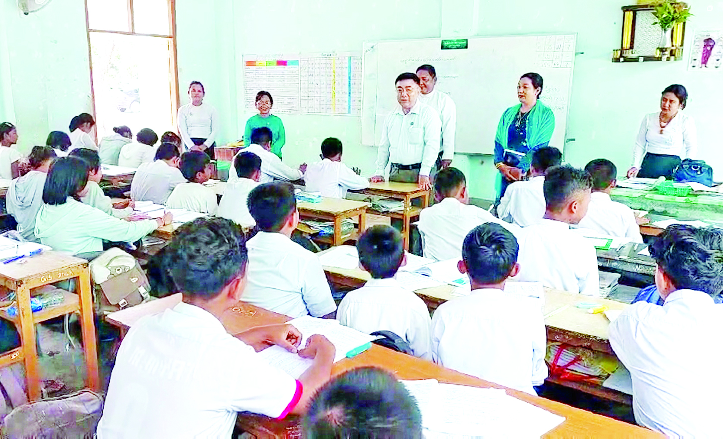 ပညာရေးဝန်ကြီးဌာန ပြည်ထောင်စုဝန်ကြီး ဒေါက်တာညွန့်ဖေသည် မန္တလေးတိုင်းဒေသကြီးပညာရေးမှူး ဦးကျော်မိုးထွန်း၊ တာဝန်ရှိသူများနှင့်အတူ ယနေ့မွန်းလွဲပိုင်းတွင် မိတ္ထီလာမြို့ အမှတ်(၅) အခြေခံပညာအထက်တန်းကျောင်း(ရှမ်းတဲ)၌ သုံးထပ်စာသင်ဆောင်တည်ဆောက်ရေး ပြင်ဆင်ဆောင်ရွက်ထားရှိမှုအခြေအနေများကို ကြည့်ရှုစစ်ဆေးပြီး အေးချမ်းစွာပညာသင်ကြားလျက်ရှိသော ကျောင်းသား ကျောင်းသူများအား ရင်းရင်းနှီးနှီးတွေ့ဆုံ အားပေးစကားပြောကြားသည်။