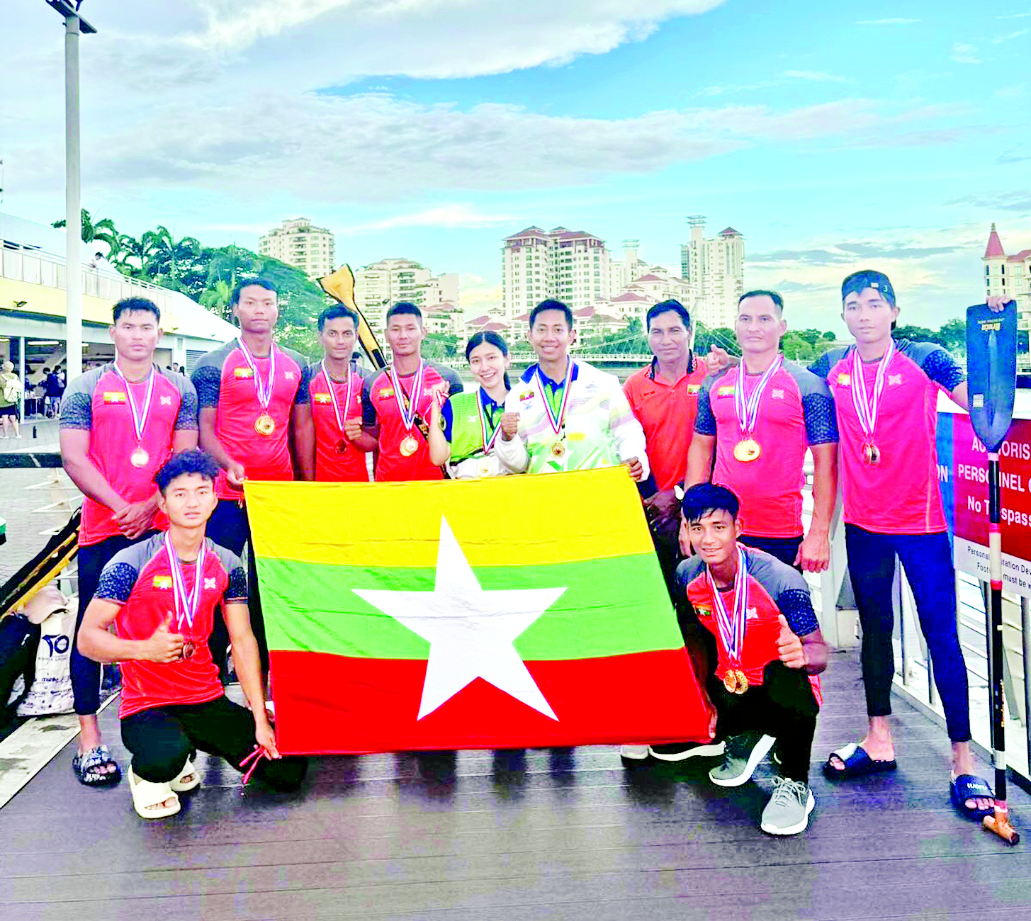 မြန်မာလှေလှော်အဖွဲ့အတွက် ရွှေတံဆိပ် ၁၀ ခုကို မီတာ ၅၀၀ ကနူးအလွတ်တန်း တစ်ယောက် လှော်ပြိုင်ပွဲတွင် မျိုးလှိုင်ဝင်း၊ မီတာ ၅၀၀ ကနူး နှစ်ယောက်တွဲ အလွတ်တန်းပြိုင်ပွဲတွင် ကျော်ဇေယျနှင့် သန့်ဇင်ဦးအတွဲ၊ မီတာ ၅၀၀ ကနူးလေးယောက်လှော်အလွတ်တန်းပြိုင်ပွဲတွင် ကျော်ဇေယျ၊သန့်ဇင်ဦး၊ ထွဋ်ခေါင် ဇော်၊ မျိုးလှိုင်ဝင်းအတွဲ၊ မီတာ ၂၀၀ ကနူးလေးယောက်လှော်အလွတ်တန်းပြိုင်ပွဲတွင် ကျော်ဇေယျ၊ သန့်ဇင်ဦး၊ ထွဋ်ခေါင်ဇော်၊ မျိုးလှိုင်ဝင်းအတွဲ၊ မီတာ ၂၀၀ ယူ-၁၅+ယူ-၁၈ ကနူးတစ်ယောက်လှော်ပြိုင်ပွဲတွင် ထွဋ်ခေါင်ဇော်၊ မီတာ ၂၀၀ ကနူးအလွတ်တန်း တစ်ယောက်လှော်ပြိုင်ပွဲတွင် မျိုးလှိုင်ဝင်း၊ မီတာ ၂၀၀ ကနူး နှစ်ယောက်လှော် အလွတ်တန်းပြိုင်ပွဲတွင် မျိုးလှိုင်ဝင်းနှင့် ကျော်ဇေယျအတွဲ၊ မီတာ ၅၀၀ ယူ-၁၅+ယူ-၁၈ ကနူး တစ်ယောက်လှော်ပြိုင်ပွဲတွင် ထွဋ်ခေါင်ဇော်၊ မီတာ ၁၀၀၀ ယူ-၁၇+ယူ-၁၈ ကယက် တစ်ယောက်လှော်ပြိုင်ပွဲ တွင် ဇေယျာထွန်း၊ မီတာ ၁၀၀၀ ကနူးတစ်ယောက်လှော်အလွတ်တန်းပြိုင်ပွဲတွင် သန့်ဇင်ဦးတို့က ဆွတ်ခူးရရှိသည်။