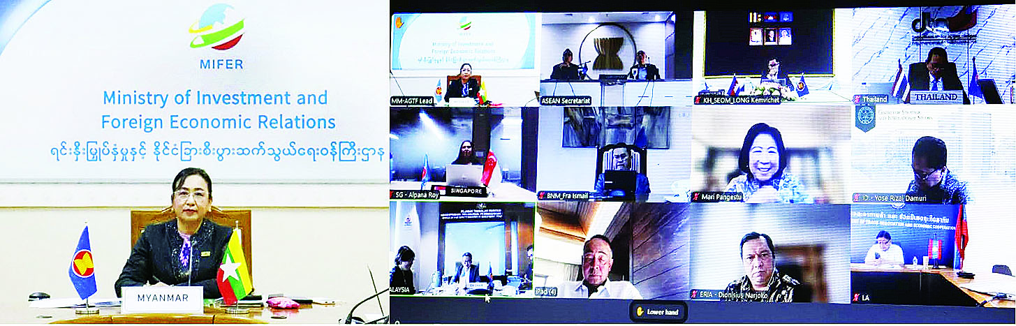 တတိယအကြိမ်မြောက် အာဆီယံပထဝီစီးပွားရေးလုပ်ငန်းအဖွဲ့အစည်းအဝေး (3rd Meeting of ASEAN Geoeconomics Task Force)ကို ယနေ့တွင် ဗီဒီယိုကွန်ဖရင့်စနစ်ဖြင့် ကျင်းပရာ မြန်မာနိုင်ငံ၏ အာဆီယံပထဝီစီးပွားရေးလုပ်ငန်းအဖွဲ့ ခေါင်းဆောင် ရင်းနှီးမြှုပ်နှံမှုနှင့်နိုင်ငံခြားစီးပွားဆက်သွယ်ရေးဝန်ကြီးဌာန ဒုတိယဝန်ကြီး ဒေါက်တာဝါဝါမောင် ဦးဆောင်သည့် ကိုယ်စားလှယ်အဖွဲ့ တက်ရောက်သည်။