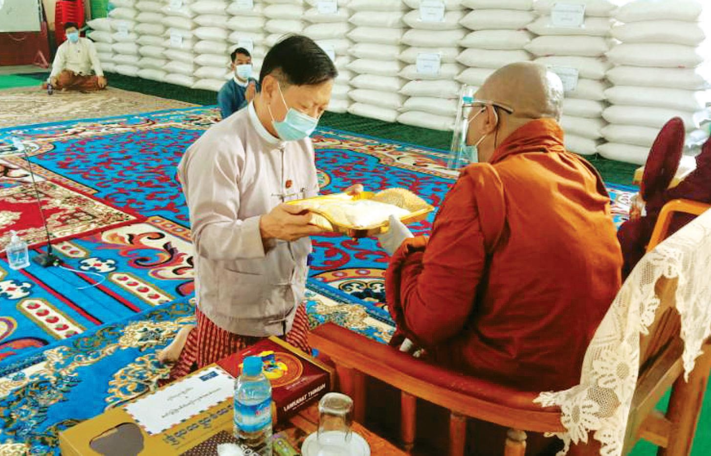 နေပြည်တော် ဇမ္ဗူသီရိမြို့နယ် နှင့် ဒက္ခိဏသီရိမြို့နယ်တို့ရှိ ဘုန်းတော်ကြီး ကျောင်းများနှင့် သီလရှင်ကျောင်းများသို့ ဆွမ်းဆန် တော် ဆက်ကပ်လှူဒါန်းပွဲတွင် Coronavirus Disease 2019 (Covid-19) ရောဂါ ကာကွယ်၊ ထိန်းချုပ်၊ တုံ့ပြန် နေစဉ်ကာလအတွင်း ဇမ္ဗူသီရိမြို့နယ် ရှိ ဘုန်းတော်ကြီးကျောင်း ၁၄ ကျောင်း တို့တွင် သီတင်းသုံးဝါဆိုတော်မူကြသော ရဟန်း၊ သာမဏေ ၆၄၁ ပါး အတွက် ဆွမ်းဆန်တော်အိတ် ၈၂ အိတ်ကို လည်းကောင်း၊ ဒက္ခိဏသီရိမြို့နယ် ရှိ ဘုန်းတော်ကြီးကျောင်း ၄၀ နှင့် သီလရှင်ကျောင်းတစ်ကျောင်းတို့တွင် သီတင်းသုံးဝါဆိုတော်မူကြသော ရဟန်း၊ သာမဏေ ၆၁၇ ပါး၊ သီလရှင် ၉၇ ပါးတို့အတွက် ဆွမ်းဆန်တော် အိတ် ၁၃၂ အိတ်ကိုလည်း ကောင်း၊ စုစုပေါင်း ဆွမ်းဆန်တော် ၂၁၄ အိတ်တို့ကို ဆက်ကပ်လှူဒါန်းခဲ့ခြင်းဖြစ်ကြောင်း သိရသည်။
