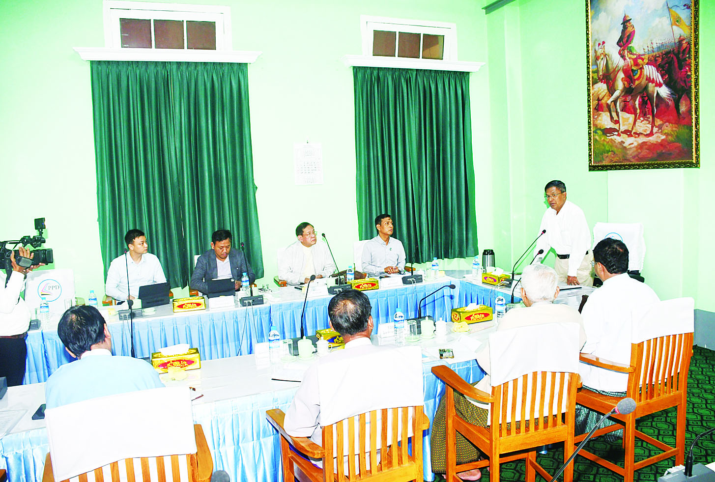 စာဆိုဗိမာန်အဆောက်အအုံတွင် ခင်းကျင်းပြသမှုဆိုင်ရာ စိစစ်အတည်ပြုအဖွဲ့ဥက္ကဋ္ဌ ပြန်ကြားရေးဝန်ကြီးဌာန ဒုတိယဝန်ကြီး ဦးရဲတင့်သည် ယနေ့နံနက်ပိုင်းက ရန်ကုန်မြို့ သိမ်ဖြူလမ်းရှိ ပုံနှိပ်ရေးနှင့်ထုတ်ဝေရေးဦးစီးဌာန အစည်းအဝေးခန်းမ၌ ကျင်းပသည့် စာဆိုဗိမာန်တည်ဆောက်ပြီးစီးပါက အတွင်းပိုင်းအခန်းများ ပြင်ဆင်ရေးအတွက် ညှိနှိုင်းအစည်းအဝေးသို့ တက်ရောက်သည်။
