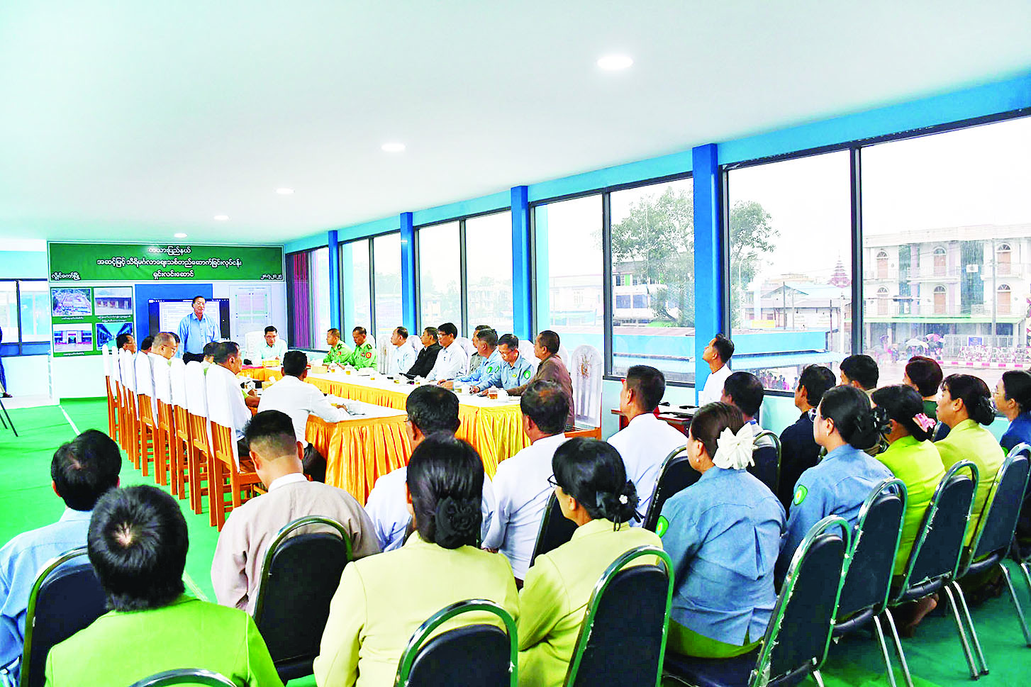 တွေ့ဆုံစဉ် တာဝန်ရှိသူများက ဈေးသစ်တည်ဆောက်ပြီးစီးမှုနှင့် ဈေးရုံသစ်များ တည်ဆောက်လျက်ရှိသည့်အခြေအနေများကို ရှင်းလင်းတင်ပြရာ နိုင်ငံတော် စီမံအုပ်ချုပ်ရေးကောင်စီအဖွဲ့ဝင်က လိုအပ်သည်များ ပေါင်းစပ်ညှိနှိုင်းပေးသည်။