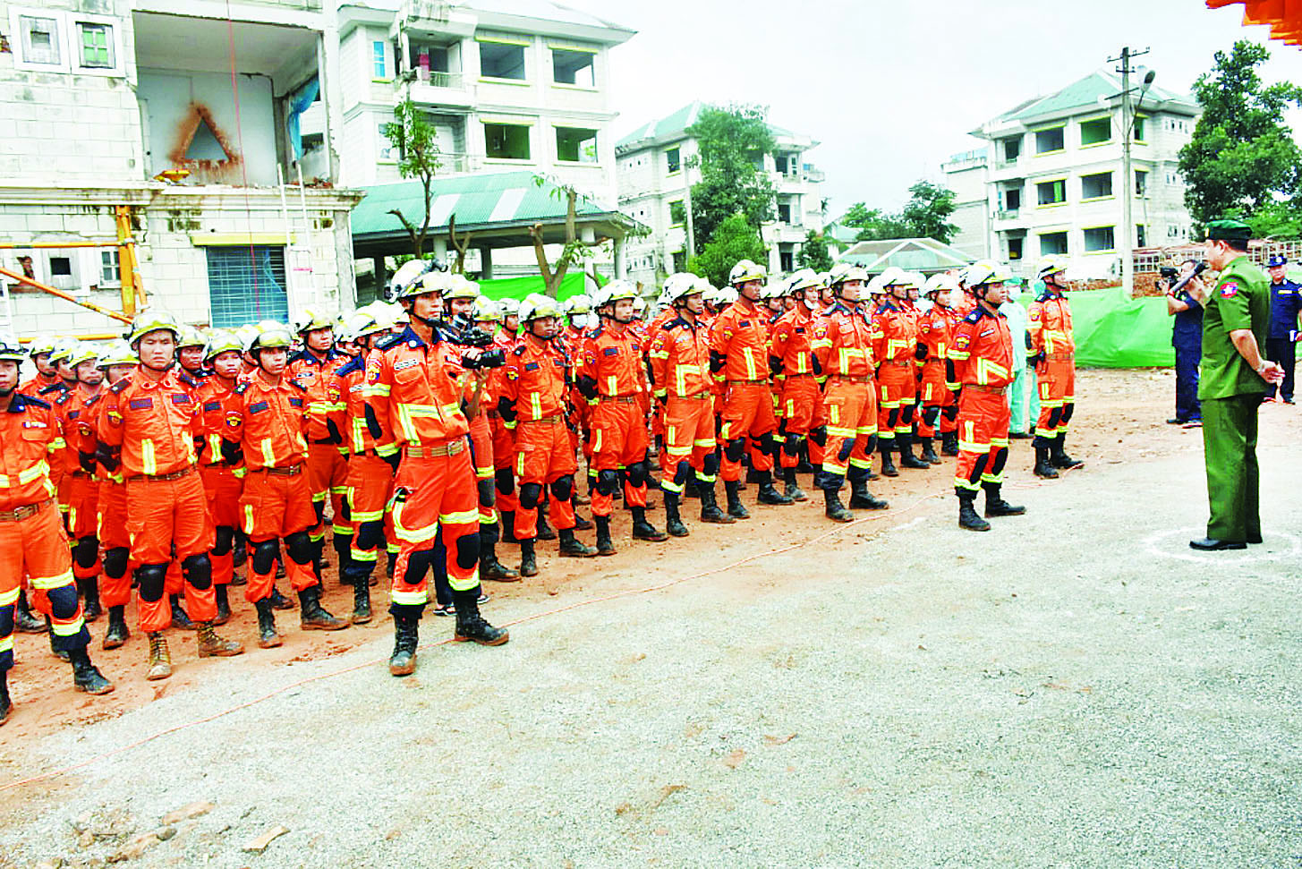မြို့ပြရှာဖွေကယ်ဆယ်ရေးအဖွဲ့ (Medium Urban Search and Rescue Team) ဖွဲ့စည်းရန်ရည်ရွယ်၍ မေ ၁၂ ရက်မှ ဩဂုတ် ၁ ရက်အထိရက်သတ္တ ၁၂ ပတ်ကြာ စုဖွဲ့လေ့ကျင့်လျက်ရှိသော ပြည်ထဲရေးဝန်ကြီးဌာန၊ မီးသတ်ဦးစီးဌာနမှ အထူးရှာဖွေကယ်ဆယ်ရေးတပ်ဖွဲ့ဝင် ၁၀၀ တို့သည် ယမန်နေ့က ဇမ္ဗူသီရိမြို့နယ် ဗလသိဒ္ဓိရပ်ကွက်၌ ငလျင်ဘေးအန္တရာယ်ဆိုင်ရာ လက်တွေ့ကယ်ဆယ်ရေးလေ့ကျင့်ခန်းများ ပြုလုပ်ဆောင်ရွက်ခဲ့ရာ ပြည်ထောင်စုဝန်ကြီး ဒုတိယဗိုလ်ချုပ်ကြီး ထွန်းထွန်းနောင် တက်ရောက်ကြည့်ရှုအားပေးပြီး လိုအပ်သည်များမှာကြားကာ ဂုဏ်ပြုဆုငွေများချီးမြှင့်ပေးအပ်ခဲ့သည်။
