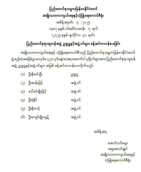 ပြည်ထောင်စုရာထူးဝန်အဖွဲ့ ဥက္ကဋ္ဌနှင့် အဖွဲ့ဝင်များ ခန့်အပ်တာဝန်ပေးခြင်း