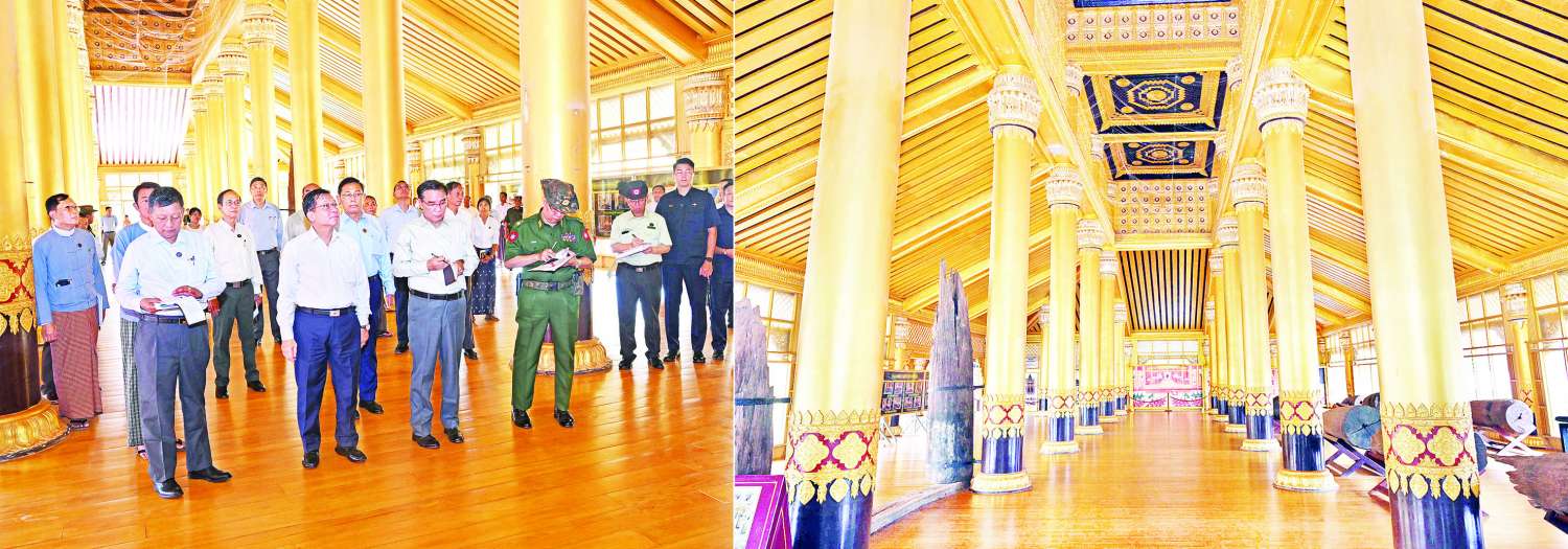 ဦးစွာ နိုင်ငံတော်လုံခြုံရေးနှင့် အေးချမ်းသာယာရေးကော်မရှင်ဥက္ကဋ္ဌနှင့် ဇနီး၊ အဖွဲ့ဝင်များသည် ကမ္ဘောဇသာဒီရွှေနန်းတော်သို့ ရောက်ရှိကြပြီး ရွှေနန်းတော်အတွင်း ယခင်မြေနန်းပြာသာဒ်ဆောင်နေရာမှ တူးဖော်ရရှိသည့် ကျွန်းတိုင်လုံးကြီးများပြသထားရှိမှု၊ ရှေးခေတ်မြန်မာမင်းတို့၏ ကန်တော့ခံအခမ်းအနားပုံစံအား ရေးဆွဲပြသထားရှိမှု၊ အနော်ရထာမင်းတရားကြီး၏ သီရိဇေယျဘူမိ ရွှေနန်းတော်(ပုဂံခေတ်)၊ ဘုရင့်နောင်မင်းတရားကြီး၏ ကမ္ဘောဇသာဒီရွှေနန်းတော်(ဟံသာဝတီခေတ်)၊ အလောင်းမင်းတရားကြီး၏ ရွှေဘုံရတနာမင်္ဂလာရွှေနန်းတော်(ကုန်းဘောင်ခေတ်)၊ မင်းတုန်းမင်းတရားကြီး၏ မြနန်းစံကျော်ရွှေနန်းတော်(ရတနာပုံခေတ်) စသည့် နန်းတော်ကြီးများအား နဂိုမူလပုံစံအတိုင်း တည်ဆောက်ပြုပြင်ထိန်းသိမ်းထားရှိမှု မှတ်တမ်းဓာတ်ပုံများ၊ ကမ္ဘောဇသာဒီရွှေနန်းတော်အား ပြန်လည်ပြုပြင်ထိန်းသိမ်းရေးလုပ်ငန်းများ ဆောင်ရွက်ထားရှိမှု၊ ရှေးဘုရင်များ အသုံးပြုခဲ့သည့် အသုံးအဆောင်ပစ္စည်းများပြသထားရှိမှု၊ မြေနန်းပြာသာဒ် တော်ကြီးထိန်းသိမ်းထားရှိမှု၊ ကမ္ဘောဇသာဒီရွှေနန်းတော်အား ပြန်လည်ဖော်ထုတ်ခြင်းမှတ်တမ်း ဓာတ်ပုံများပြသထားရှိမှု စသည့်ပြခန်းအသီးသီးအား လှည့်လည်ကြည့်ရှုစစ်ဆေးရာ တာဝန်ရှိသူများက ရှင်းလင်းတင်ပြကြသည်။