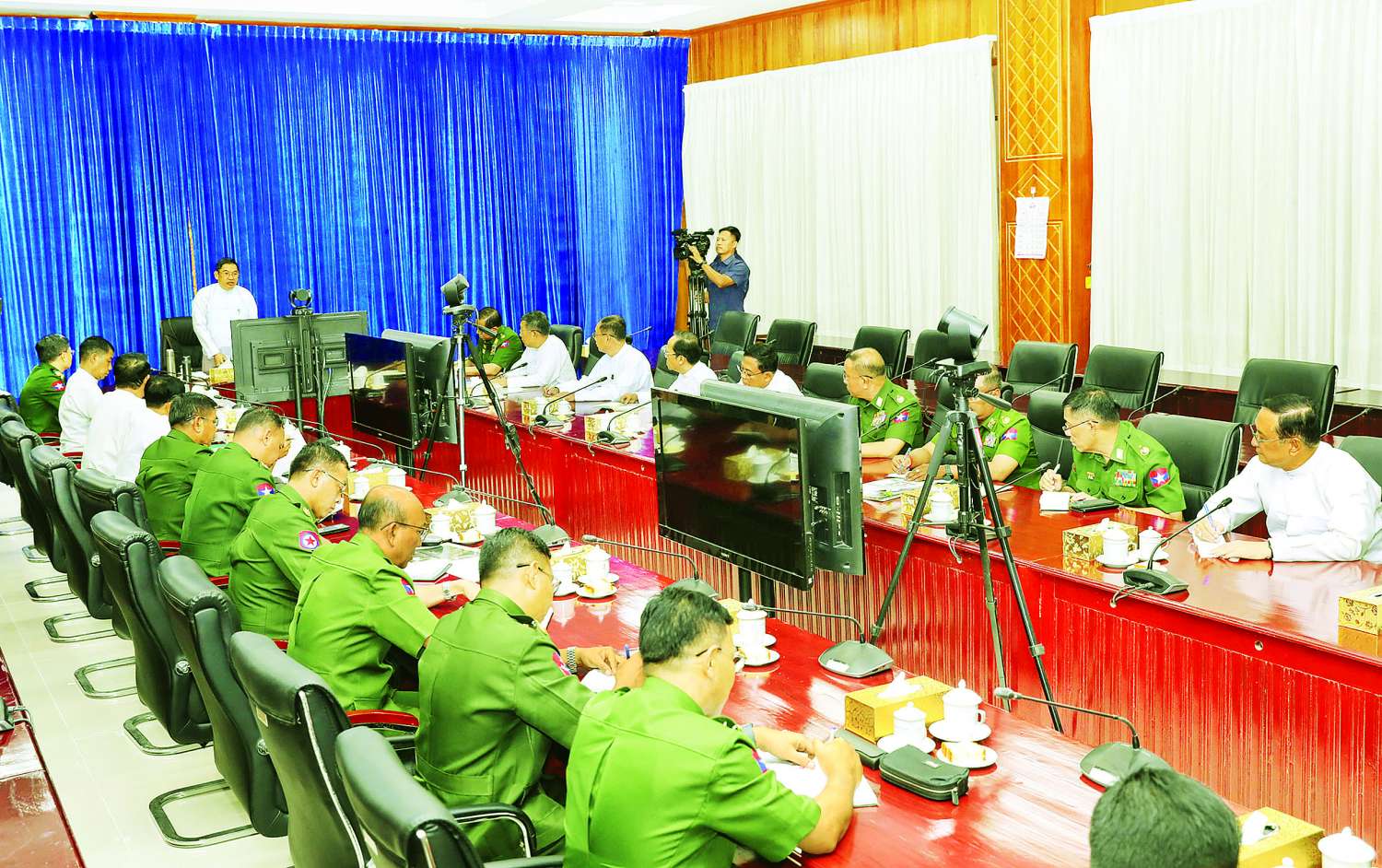 ထို့နောက် ဈာပနအခမ်းအနားကျင်းပရေးဦးစီးကော်မတီ ဒုတိယဥက္ကဋ္ဌ (၁) ပြည်ထဲရေးဝန်ကြီးဌာန ပြည်ထောင်စုဝန်ကြီး ဒုတိယဗိုလ်ချုပ်ကြီး ထွန်းထွန်းနောင်က ဈာပနအခမ်းအနားကျင်းပမည့် လမ်းကြောင်းတစ်လျှောက် ပြင်ဆင်ဆောင်ရွက်ရမည့် လုပ်ငန်းစဉ်များ၊ ဖိတ်ကြားရေး၊ တည်းခိုရေးနှင့် သယ်ယူပို့ဆောင်ရေးလုပ်ငန်းများ စနစ်တကျဆောင်ရွက်နိုင်ရေး၊ ဈာပနအခမ်းအနားကျင်းပမည့်နေရာ အဝင်/ အထွက် လမ်းကြောင်းတစ်လျှောက် သန့်ရှင်းသပ်ရပ်မှုရှိစေရေးနှင့် စနစ်တကျရှိစေရေး၊ ကော်မတီအလိုက် စနစ်တကျ ပူးပေါင်းဆောင်ရွက်နိုင်ရေးလုပ်ငန်းစဉ်များနှင့်စပ်လျဉ်း၍ ဆွေးနွေးတင်ပြသည်။