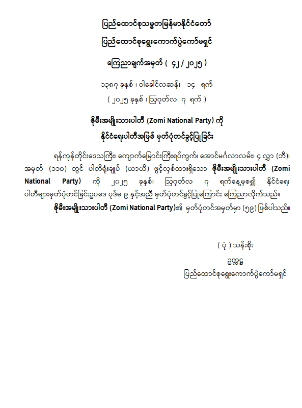 ဇိုမီးအမျိုးသားပါတီ (Zomi National Party) ကို နိုင်ငံရေးပါတီအဖြစ် မှတ်ပုံတင်ခွင့်ပြုခြင်း