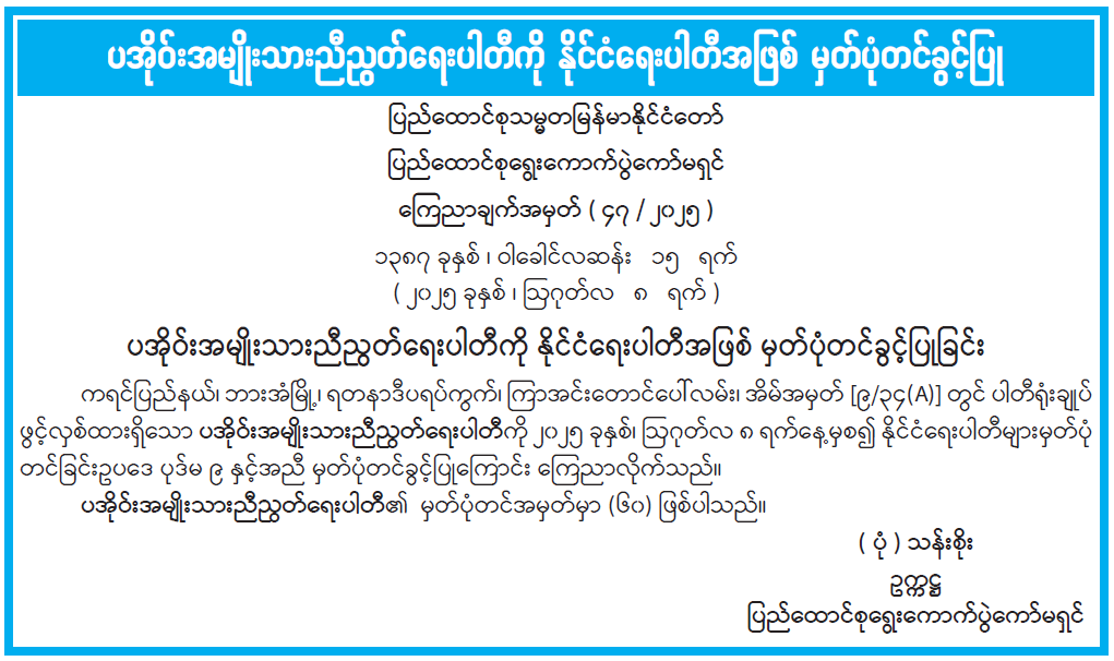 ပအိုဝ်းအမျိုးသားညီညွတ်ရေးပါတီကို နိုင်ငံရေးပါတီအဖြစ် မှတ်ပုံတင်ခွင့်ပြုခြင်း 08/09/2025 ပအိုဝ်းအမျိုးသားညီညွတ်ရေးပါတီကို နိုင်ငံရေးပါတီအဖြစ် မှတ်ပုံတင်ခွင့်ပြုခြင်း