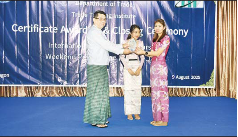 ထို့နောက် ဒုတိယဝန်ကြီးက သင်တန်းတွင် ပထမ၊ ဒုတိယ၊ တတိယနှင့် စာတမ်းအကောင်းဆုံးဆု ရရှိသူများကို ဆုချီးမြှင့်ပေးအပ်ပြီး ကုန်သွယ်ရေးဦးစီးဌာန ညွှန်ကြားရေးမှူးချုပ်က သင်တန်းဆင်းအောင်လက်မှတ်များ ချီးမြှင့်ပေးအပ်သည်။