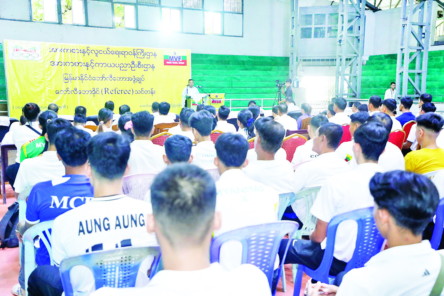 အားကစားနှင့်လူငယ်ရေးရာဝန်ကြီးဌာန အားကစားနှင့်ကာယပညာဦးစီးဌာနနှင့် မြန်မာနိုင်ငံဘော်လီဘောအဖွဲ့ချုပ်တို့ ပူးပေါင်းဖွင့်လှစ်သော မြန်မာနိုင်ငံဘော်လီဘော ဒိုင်လူကြီး (Referee) သင်တန်းဖွင့်ပွဲအခမ်းအနားကို ယနေ့နံနက်ပိုင်းက ရန်ကုန်တိုင်းဒေသကြီး မင်္ဂလာတောင်ညွန့်မြို့နယ် မိုးလုံလေလုံအားကစားရုံ၌ ကျင်းပရာ အားကစားနှင့်လူငယ်ရေးရာဝန်ကြီးဌာန ဒုတိယဝန်ကြီး ဦးထိန်လင်းနှင့် တာဝန်ရှိသူများ၊ မြန်မာနိုင်ငံဘော်လီဘောအဖွဲ့ချုပ်ဥက္ကဋ္ဌ၊ သင်တန်းနည်းပြများ၊ ဒိုင်လူကြီးများနှင့် သင်တန်းသား သင်တန်းသူများ တက်ရောက်ကြသည်။
