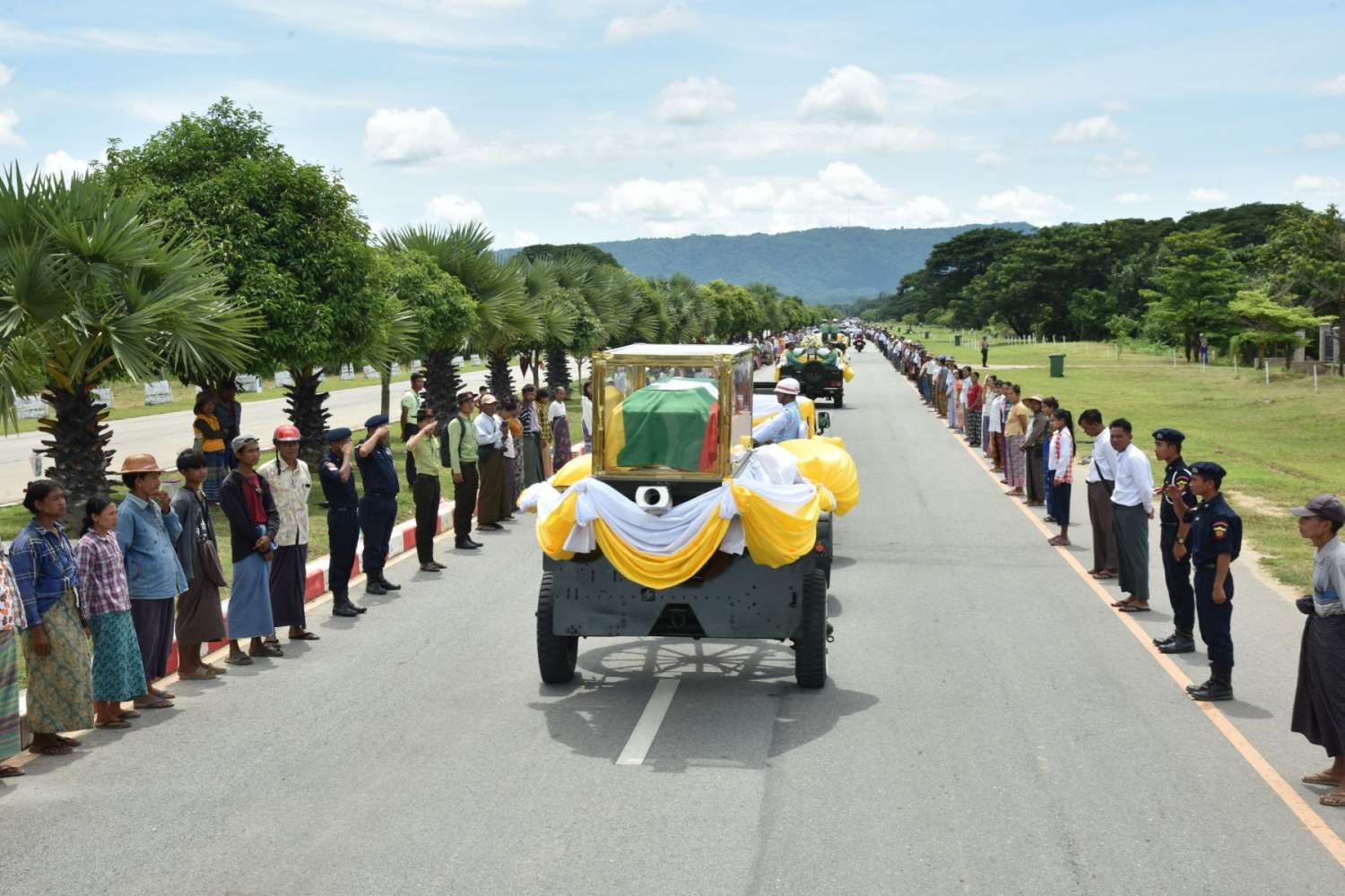 ယင်းနောက် နိုင်ငံတော်လုံခြုံရေးနှင့် အေးချမ်းသာယာရေးကော်မရှင်ဥက္ကဋ္ဌ၊ ကော်မရှင်ဒုတိယဥက္ကဋ္ဌနှင့် ပြည်ထောင်စုအဆင့်ပုဂ္ဂိုလ်များ၊ ကာကွယ်ရေးဦးစီးချုပ်ရုံးမှ အဆင့်မြင့်တပ်မတော်အရာရှိကြီးများက နေရာယူကြပြီး တပ်မတော်ဂုဏ်ပြု သေနတ်ပစ်အဖွဲ့က ဂုဏ်ပြုစစ်ရေးပြအစီအစဉ်အတိုင်းဆောင်ရွက်ကာ သေနတ်မြေစိုက်ဦးခိုက်အလေးပြုကြပြီး သေနတ်မြှောက်အလေးပြုကြသည်။