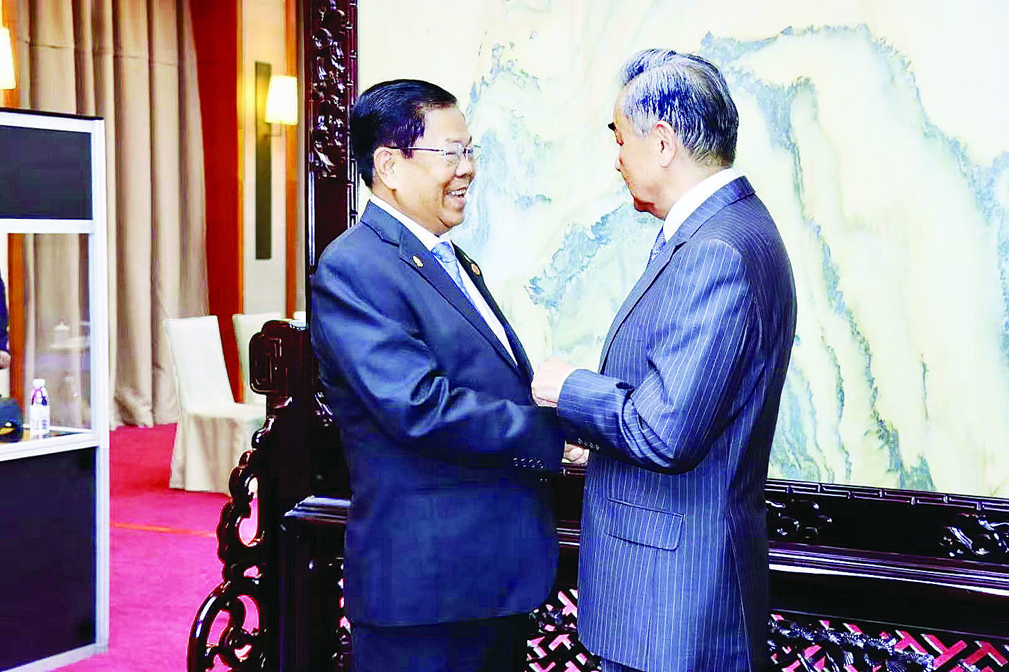 ထိုင်းနိုင်ငံခြားရေးဝန်ကြီးနှင့် တွေ့ဆုံစဉ် နှစ်နိုင်ငံဖြစ်ပေါ် တိုးတက်မှုများနှင့် နယ်စပ်ပူးပေါင်း ဆောင်ရွက်ရေးဆိုင်ရာ ကိစ္စရပ်များကို ဆွေးနွေးခဲ့ပြီး တရုတ် နိုင်ငံခြားရေးဝန်ကြီးနှင့် တွေ့ဆုံစဉ် နှစ်နိုင်ငံပူးပေါင်းဆောင်ရွက်ရေးဆိုင်ရာ ကိစ္စရပ်များကိုဆွေးနွေး၍ မြန်မာနိုင်ငံတွင် ပါတီစုံဒီမိုကရေစီ အထွေထွေရွေးကောက်ပွဲ ကျင်းပမည့်ကိစ္စကို ရှင်းလင်းပြောကြားခဲ့ရာ တရုတ်နိုင်ငံခြားရေးဝန်ကြီးက မြန်မာနိုင်ငံတွင် အထွေထွေရွေးကောက်ပွဲ ကျင်းပမည့်ကိစ္စနှင့် နိုင်ငံရေးဖြစ်ပေါ်တိုးတက်မှုများကို ထောက်ခံအားပေးကြောင်း ပြန်လည်ပြောကြားခဲ့သည်။