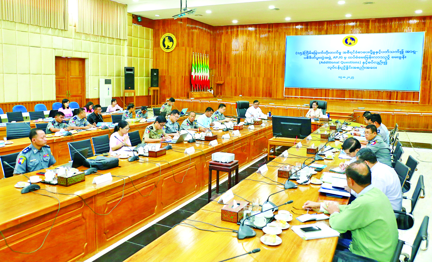 ထို့နောက်တိုးတက်မှုအစီရင် ခံစာအပေါ် ထပ်မံမေးမြန်းသည့် မေးခွန်းများနှင့် စပ်လျဉ်း၍ သက်ဆိုင်ရာ ဌာနများကလည်းကောင်း၊ ၂၀၂၅ ခုနှစ် APG နှစ်ပတ် လည်အစည်းအဝေးနှင့် သင်တန်းနှင့် နည်းပညာပေးအပ်ရေးဆိုင်ရာ အလုပ်ရုံဆွေးနွေးပွဲတွင် ဆွေးနွေးမည့်အချက်များအား ညွှန်ကြားရေးမှူးချုပ်၊ ငွေရေးကြေးရေး ကြီးကြပ်စစ်ဆေးရေးဦးစီးဌာနနှင့် တပ်ဖွဲ့မှူး၊ ငွေကြေးဆိုင်ရာ မှုခင်းတားဆီးနှိမ်နင်းရေးရဲတပ်ဖွဲ့တို့က လည်းကောင်း ရှင်းလင်းဆွေးနွေးကြသည်။