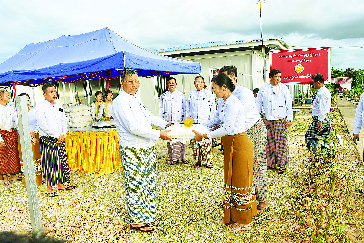 ဦးစွာ နေပြည်တော်ရှိ သာသနာရေးနှင့်ယဉ်ကျေးမှုဝန်ကြီးဌာန ရုံးဝင်းအတွင်း၌ အရာထမ်း၊ အမှုထမ်းများနှင့် ဝန်ထမ်းမိသားစုဝင်များ ယာယီနေထိုင်လျက်ရှိသည့် ရွှေအင်ကြင်းရိပ်သာ၊ ရွှေတမာရိပ်သာနှင့် ရွှေညောင်ပင်ရိပ်သာတို့ရှိ Container House များနှင့် ကွန်ကရစ်လမ်းများ ခင်းကျင်းပြီးစီးမှု၊ သာသနာရေးနှင့်ယဉ်ကျေးမှုဝန်ကြီးဌာန လေ့ကျင့်ရေးကဇာတ်ရုံအနီးရှိ Container House များ၊ သဒ္ဓမ္မဝေပုလ္လကျောင်းတိုက်ရှိ Con-tainer House များနှင့် စမတောင်ဝန်ထမ်းအိမ်ရာရှိ Container House များတွင် ဝန်ထမ်းနှင့် မိသားစုဝင်များ နေထိုင်မှုတို့ကို ကြည့်ရှုစစ်ဆေးပြီး ဝန်ထမ်းနှင့် မိသားစုဝင်များအား တွေ့ဆုံ၍ မိသားစုတစ်စုလျှင် ဆန်ခြောက်ပြည်အိတ်တစ်အိတ်နှင့် ၅၀ ကျပ်သားဝင် ဆီတစ်ဘူးစီတို့ကို ဝန်ထမ်းမိသားစု ၁၃၃၃ စုတို့အတွက် ထောက်ပံ့ပေးအပ်သည်။