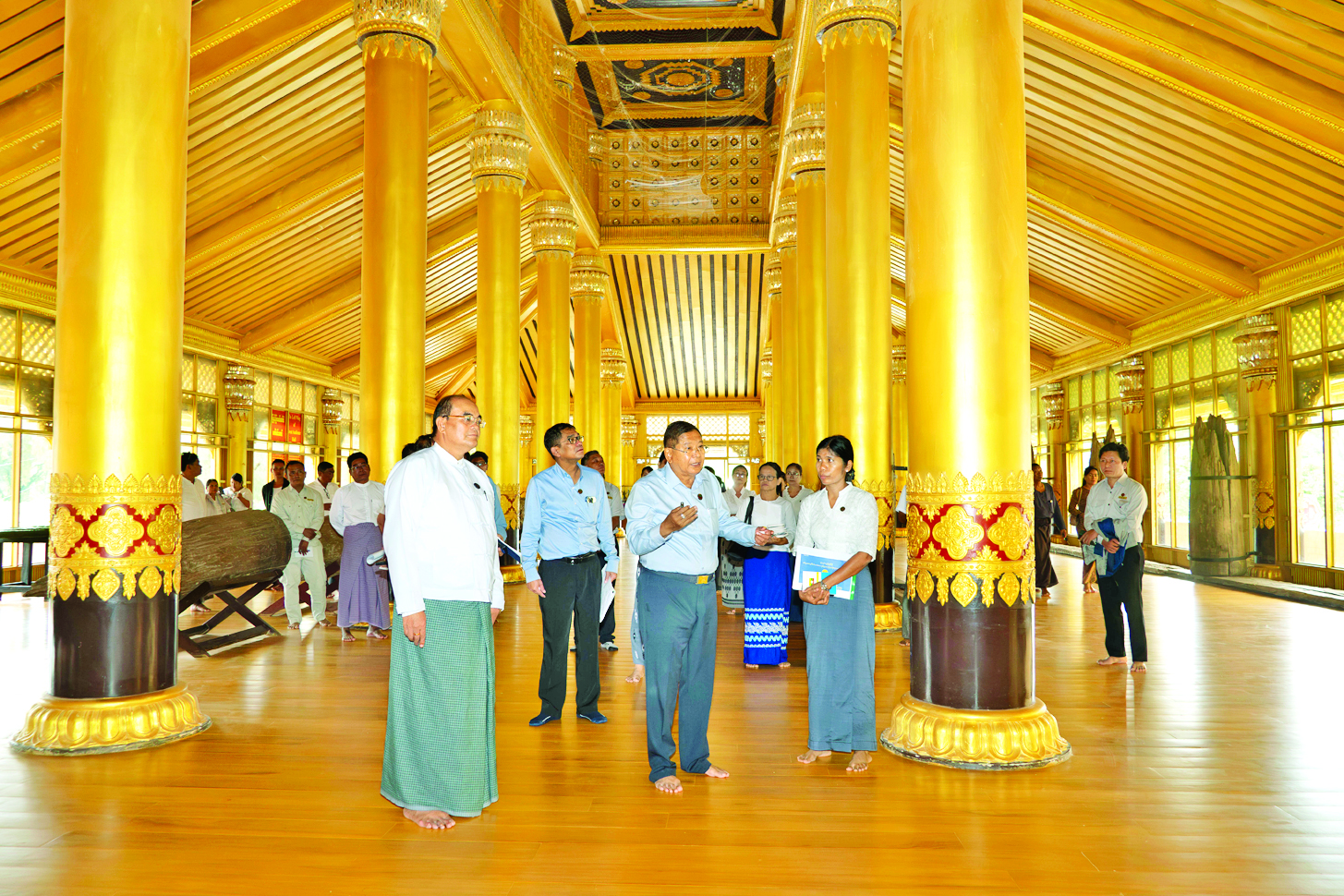 ထို့နောက် ပဲခူးမြို့ရှိ ကမ္ဘောဇသာဒီနန်းတော် လက်ဝဲဝင်းဆောင်၊ ဘမယာသနပလ္လင်ဆောင်၊ လက်ယာဝင်းဆောင်တို့၏ အမိုး ရေလုံဆေးသုတ်ခြင်း၊ ရွှေဆေး သုတ်ခြင်းနှင့် မြန်မာမှုပန်းကနုတ်များ နှစ်ကာလကြာမြင့်မှုကြောင့် ပျက်စီးလာခြင်းကို မူလလက်ရာ မပျက်ပြုပြင်ခြင်း လုပ်ငန်းဆောင်ရွက်နေမှုတို့ကို တာဝန်ရှိသူများက ရှင်းလင်းတင်ပြကြရာ ဒုတိယဝန်ကြီးက ယဉ်ကျေးမှုအမွေအနှစ် အဆောက်အအုံဖြစ်၍ အရည်အသွေးပြည့်မီပြီး လက်ရာသေသပ်ကောင်းမွန်စေရေး စေတနာထားဆောင်ရွက်ရန် မှာကြားသည်။