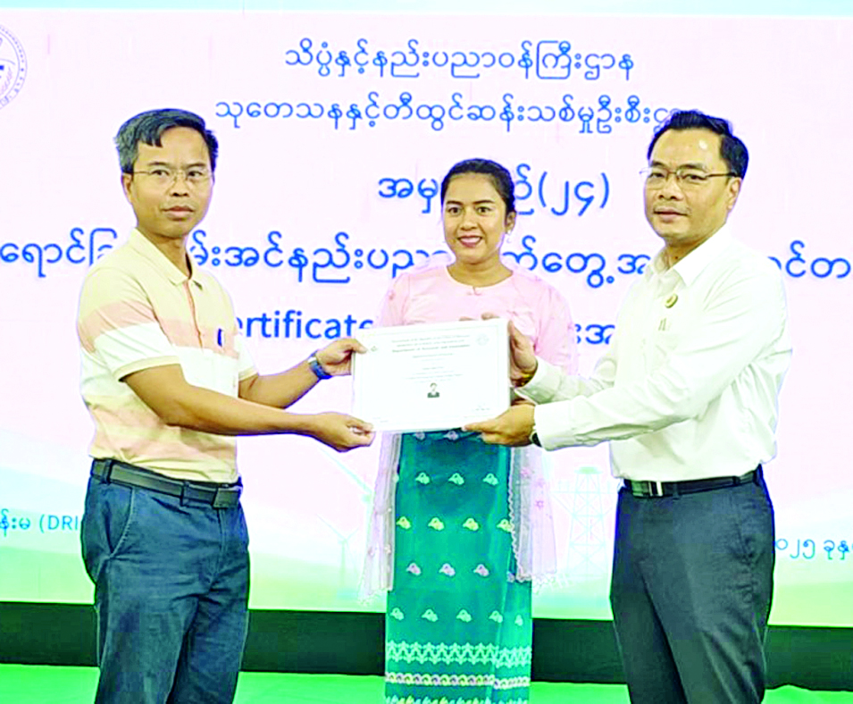 ရန်ကုန်မြို့ရှိ သုတေသနနှင့် တီထွင်ဆန်းသစ်မှု ဦးစီးဌာနက ဖွင့်လှစ်ပို့ချသည့် အမှတ်စဉ် (၂၄) နေရောင်ခြည်စွမ်းအင်နည်းပညာ လက်တွေ့အသုံးချသင်တန်း သင်တန်းဆင်းလက်မှတ်ပေးအပ်ပွဲအခမ်းအနားကို ယမန်နေ့က အဆိုပါဦးစီးဌာန၌ကျင်းပရာ သိပ္ပံနှင့်နည်းပညာ ဝန်ကြီးဌာန ဒုတိယဝန်ကြီး ဒေါက်တာအောင်ဇေယျ၊ သုတေသနနှင့် တီထွင်ဆန်းသစ်မှုဦးစီးဌာန ညွှန်ကြားရေးမှူးချုပ်နှင့် တာဝန်ရှိသူများ၊ သင်တန်းဆရာ ဆရာမ များနှင့် သင်တန်းသား သင်တန်းသူများ တက်ရောက်ကြသည်။
