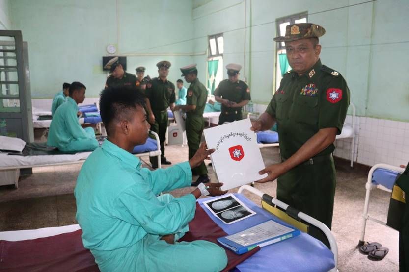 နေပြည်တော်ကောင်စီနယ်မြေ၊ ဇေယျာသီရိမြို့နယ်ရှိ တပ်မတော်ဆေးရုံကြီး (ခုတင်-၁၀၀၀)၊ ကချင်ပြည်နယ်၊ မြစ်ကြီးနားမြို့ရှိ နယ်မြေခံတပ်မတော်ဆေးရုံ၊ ရန်ကုန်တိုင်းဒေသကြီး၊ မင်္ဂလာဒုံမြို့နယ်ရှိ တပ်မတော်အရိုးရောဂါ အထူးကုဆေးရုံကြီး (ခုတင်-၅၀၀)နှင့် တပ်မတော်ဆေးရုံကြီး (ခုတင်-၁၀၀၀)၊ စစ်ကိုင်းတိုင်းဒေသကြီး၊ မုံရွာမြို့ရှိ တပ်မတော်ဆေးရုံနှင့် ပဲခူးတိုင်းဒေသကြီး၊ ပြည်မြို့ရှိ တပ်မတော်ဆေးရုံတို့၌ တက်ရောက်ဆေးကုသမှုခံယူလျက်ရှိသော အရာရှိ၊ စစ်သည်၊ မိသားစုဝင်၊ စစ်မှုထမ်းဟောင်းအဖွဲ့ဝင်များ၊ မြန်မာနိုင်ငံရဲတပ်ဖွဲ့ဝင်များ၊ ပြည်သူ့စစ် (ဌာနေ) တပ်ဖွဲ့ဝင်များနှင့် ဒေသခံပြည်သူများအား ယနေ့တွင် သက်ဆိုင်ရာတိုင်းစစ်ဌာနချုပ်များမှ တိုင်းမှူးများနှင့် တာဝန်ရှိသူများက သွားရောက်ကြည့်ရှု၍ တစ်ဦးချင်း၏ရောဂါဖြစ်ပွားမှု၊ ဆေးဝါးကုသပေးထားမှုနှင့် ကျန်းမာရေးတိုးတက် ကောင်းမွန်မှုအခြေအနေများကို မေးမြန်းအားပေးစကားပြောကြားပြီး အာဟာရဖြည့်စားသောက်ဖွယ်ရာများ ပေးအပ်သည်။