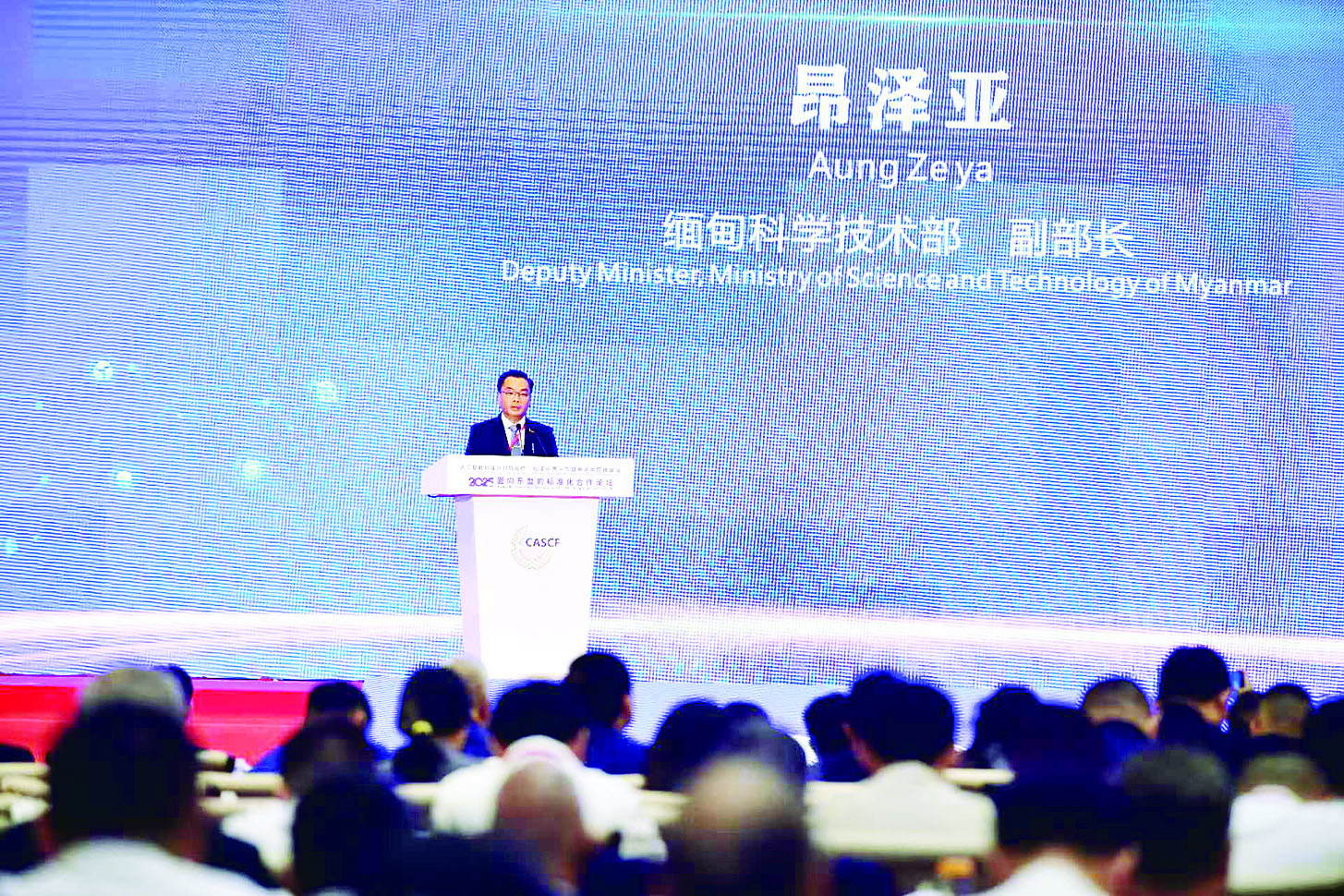 တရုတ်ပြည်သူ့သမ္မတနိုင်ငံ ကွမ်ရှီးကျွမ့်ကိုယ်ပိုင်အုပ်ချုပ်ခွင့်ရဒေသ နန်နင်းမြို့ရှိ လိယွမ်အစိုးရ ဧည့်ဂေဟာ၌ သြဂုတ် ၂၇ ရက်က AI စံချိန်စံညွှန်းများ တစ်ပြေးညီဖြစ်ကာ တီထွင်ဆန်းသစ်မှုဆိုင်ရာ ပူးပေါင်းဆောင်ရွက်မှုများဖြင့် တရုတ်-အာဆီယံ အသိုက်အဝန်း၏ အေးအတူပူအမျှမျှဝေသော အနာဂတ်ကောင်းများကို မြှင့်တင်ကြပါစို့ ခေါင်းစဉ် ဖြင့်ကျင်းပသည့် အာဆီယံကို အဓိကရှေးရှုသော စံချိန်စံညွှန်းသတ်မှတ်ရေးဖိုရမ် (2025 ASEAN- Oriented Standardization Cooperation Forum) သို့ သိပ္ပံနှင့် နည်းပညာဝန်ကြီးဌာန ဒုတိယဝန်ကြီး ဒေါက်တာအောင်ဇေယျ ဦးဆောင်သော မြန်မာကိုယ်စားလှယ်အဖွဲ့ တက်ရောက်ခဲ့သည်။
