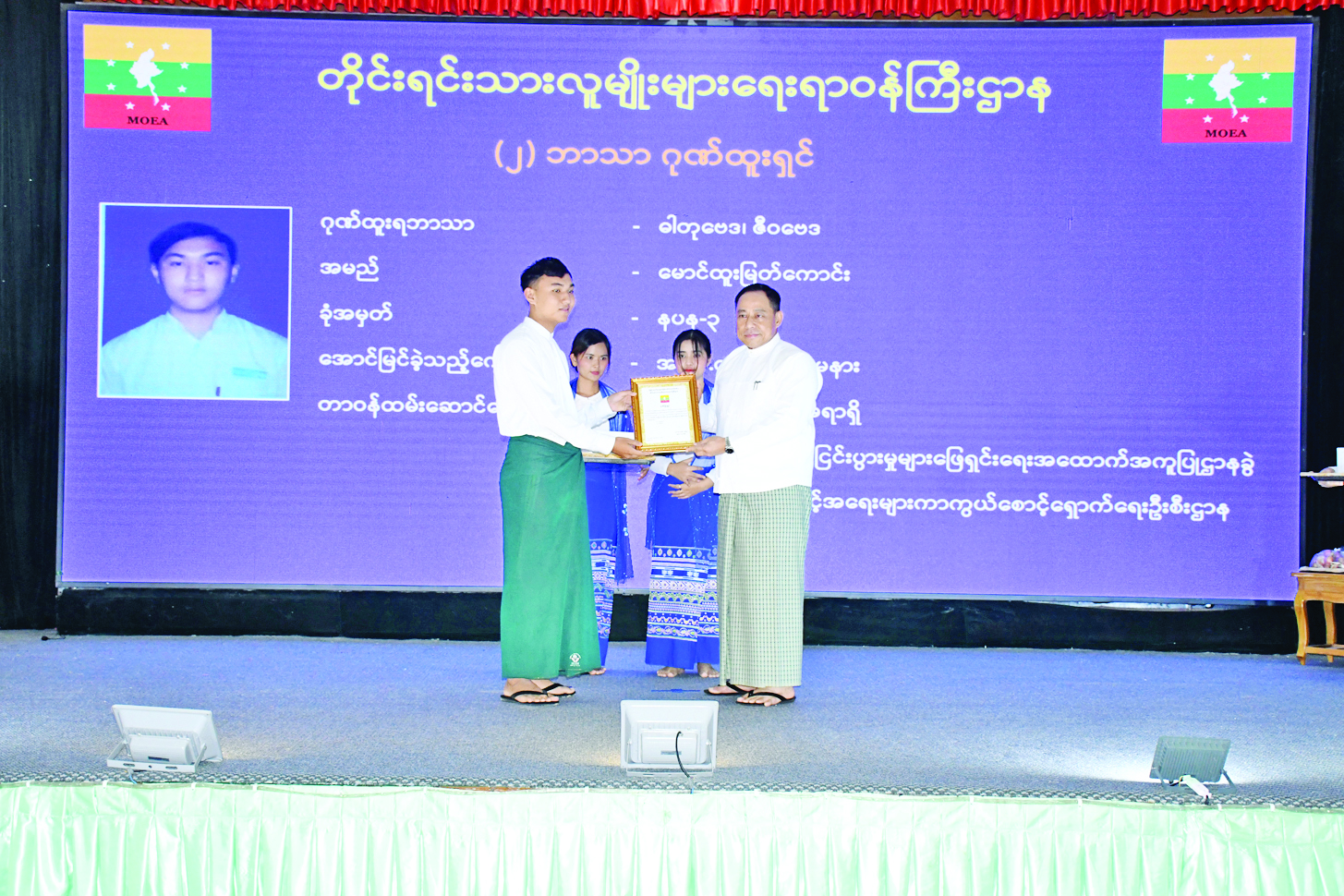 တိုင်းရင်းသားလူမျိုးများရေးရာဝန်ကြီးဌာန ၂၀၂၅ ခုနှစ် တက္ကသိုလ်ဝင်စာမေးပွဲတွင် အောင်မြင်သူများအား ဆုချီးမြှင့်ပွဲနှင့် ထောက်ပံ့ပစ္စည်းပေးအပ်ပွဲအခမ်းအနားကို ယနေ့မွန်းလွဲပိုင်းတွင် တိုင်းရင်းသားလူမျိုးများရေးရာဝန်ကြီးဌာန အစည်းအဝေးခန်းမ၌ကျင်းပရာ နယ်စပ်ရေးရာဝန်ကြီးဌာနနှင့် တိုင်းရင်းသားလူမျိုးများရေးရာ ဝန်ကြီးဌာန ပြည်ထောင်စုဝန်ကြီး ဒုတိယဗိုလ်ချုပ်ကြီးရာပြည့်၊ ဒုတိယဝန်ကြီး ဦးဇော်အေးမောင်၊ အမြဲတမ်းအတွင်းဝန်၊ ဌာနဆိုင်ရာတာဝန်ရှိသူများ၊ အရာထမ်း၊ အမှုထမ်းများ၊ ကျောင်းသား ကျောင်းသူများနှင့် ကျောင်းသားမိဘများ တက်ရောက်ကြသည်။