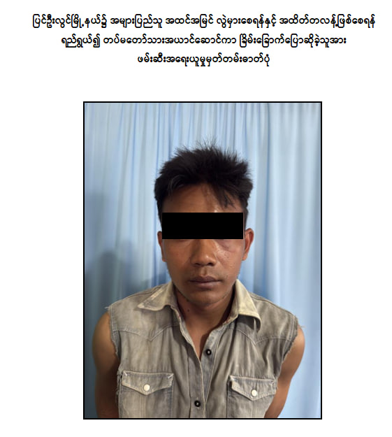 မန္တလေးတိုင်းဒေသကြီး၊ ပြင်ဦးလွင်မြို့နယ်၌ စက်တင်ဘာလ ၆ ရက်နေ့က အများပြည်သူ အထင်အမြင်လွဲမှားစေရန်နှင့် အထိတ်တလန့်ဖြစ်စေရန် ရည်ရွယ်၍ တပ်မတော်သားအယာင်ဆောင်ကာ ခြိမ်းခြောက်ပြောဆိုခဲ့သူအား ဖမ်းဆီးအရေးယူထားကြောင်း သိရသည်။