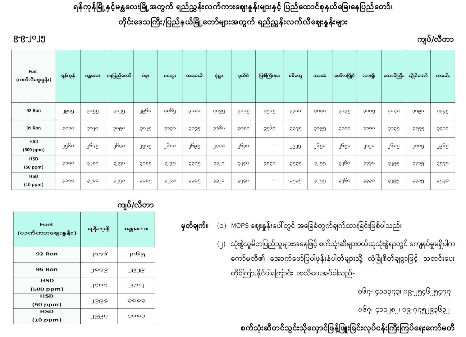 ရန်ကုန်မြို့နှင့် မန္တလေးမြို့အတွက် ရည်ညွှန်းလက်ကားဈေးနှုန်းများနှင့် ပြည်ထောင်စုနယ်မြေ နေပြည်တော်၊ တိုင်းဒေသကြီး/ ပြည်နယ် မြို့တော်များအတွက် ရည်ညွှန်းလက်လီဈေးနှုန်းများ 09/09/2025